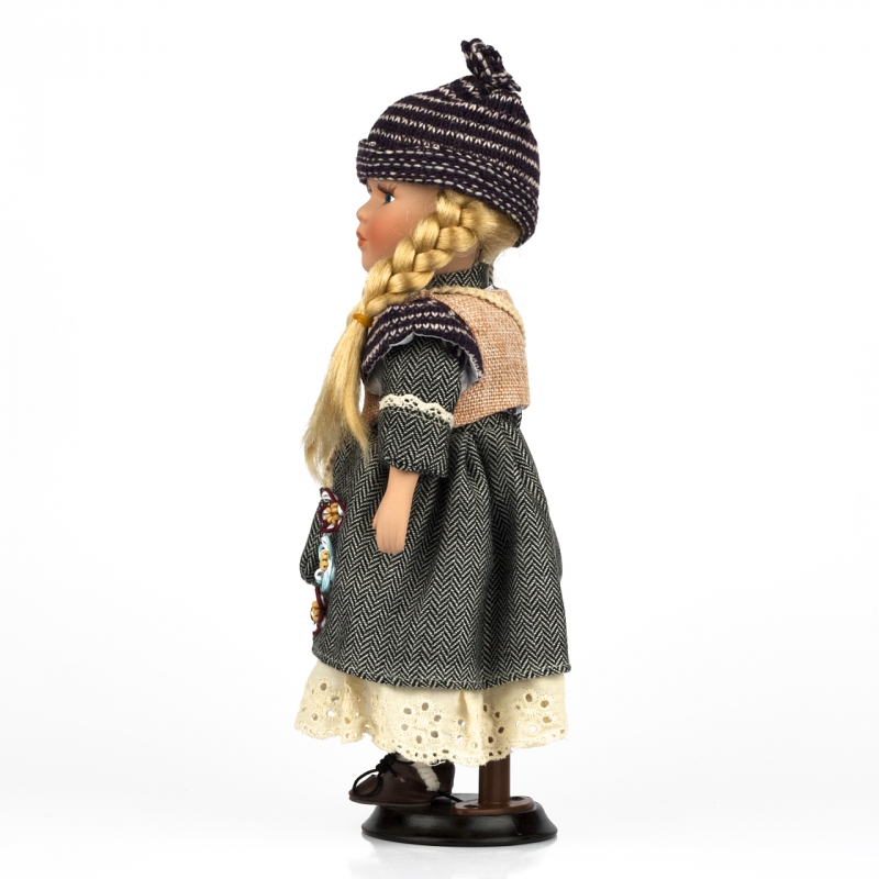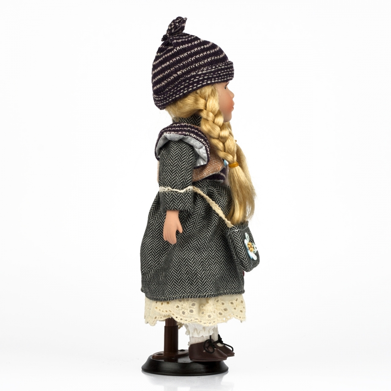 Porcelánová panenka má oblečeny tmavé šaty zdobené kytičkami, přes rameno tašku ze stejné módní kolekce a tmavou pletenou čepici. Na nohou má hnědé boty na šněrování.