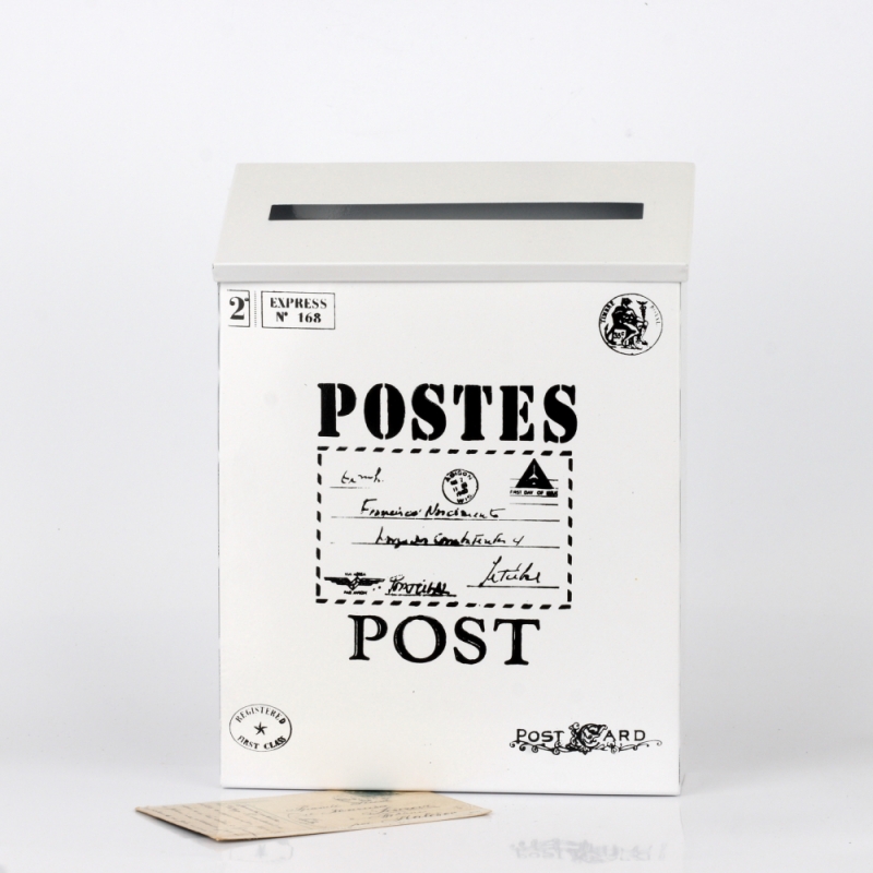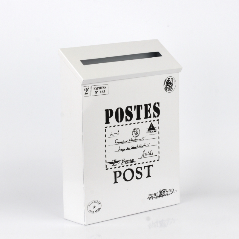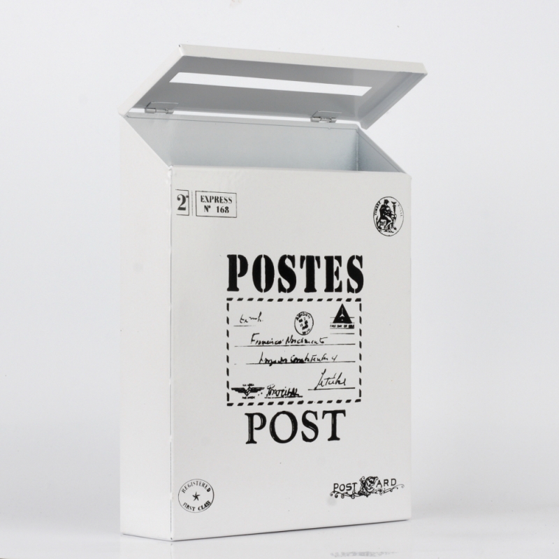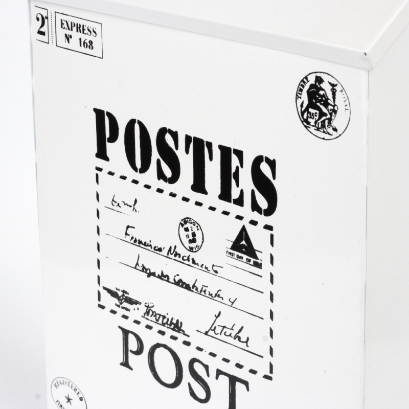 Plechová poštovní schránka v retro stylu má jednoduchý černo-bílý design, který táhne oči. Víko má otvor na dopisy, ale jde i snadno otevřít a vložit tak dovnitř schránky větší poštu.