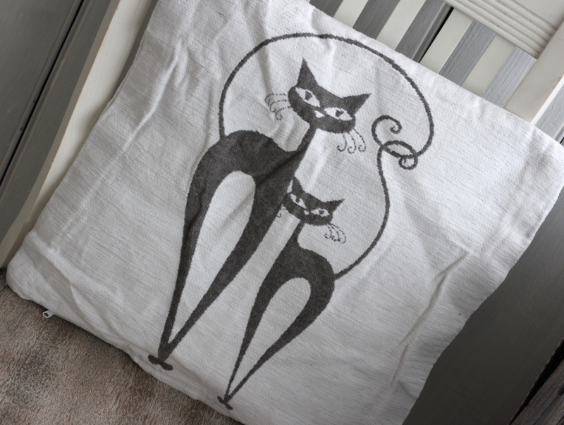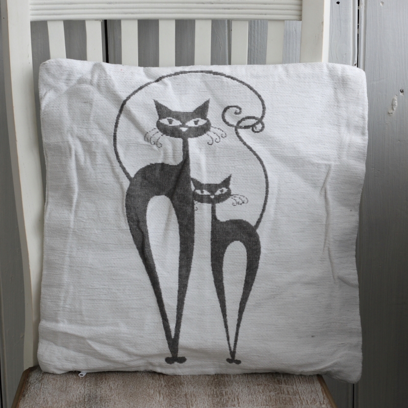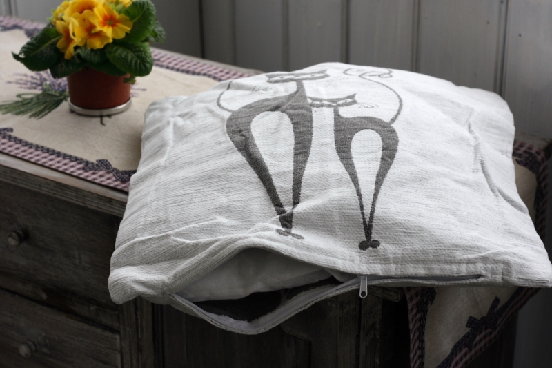 Povlak je na zip, má bílou barvu a na přední straně dvě tmavé kočičky.