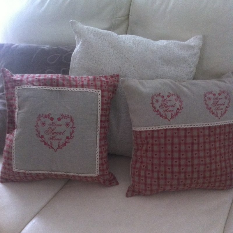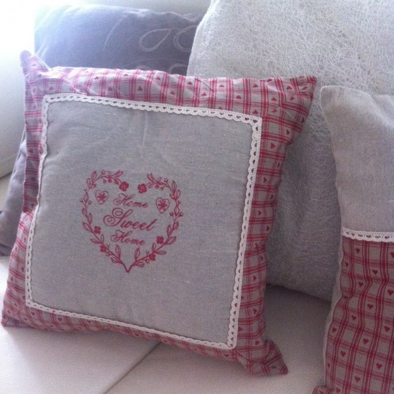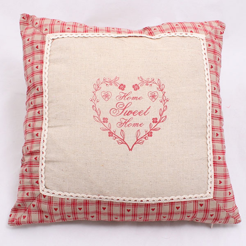 Tento povlak je vytvořen kombinací přírodní krémové a červené barvy. Povlak má kraje polštáře z kárované látky se srdíčky a střed je světlý s velkým květinovým srdcem Home sweet Home.