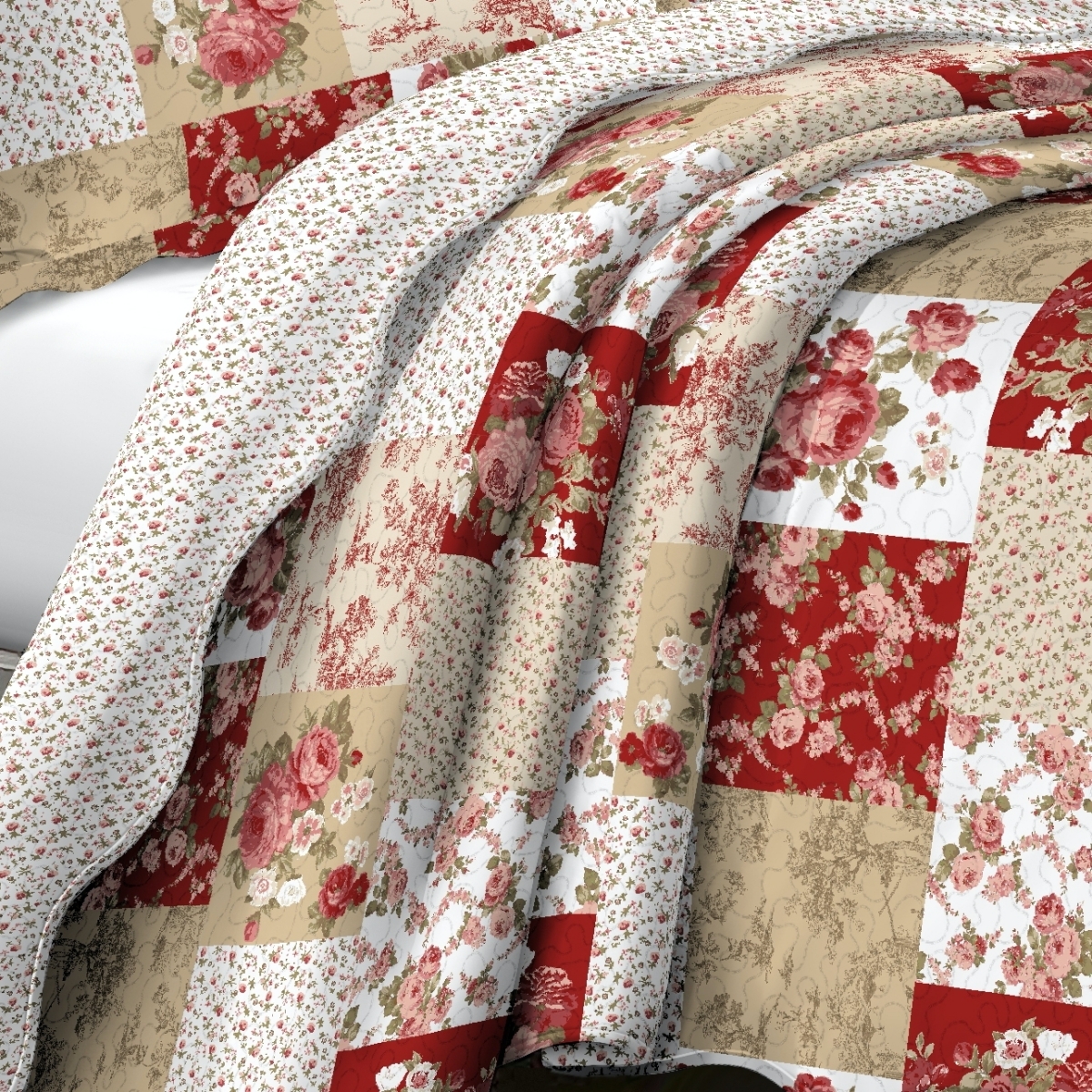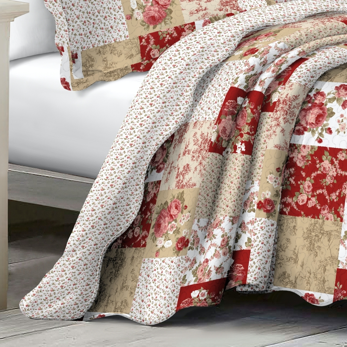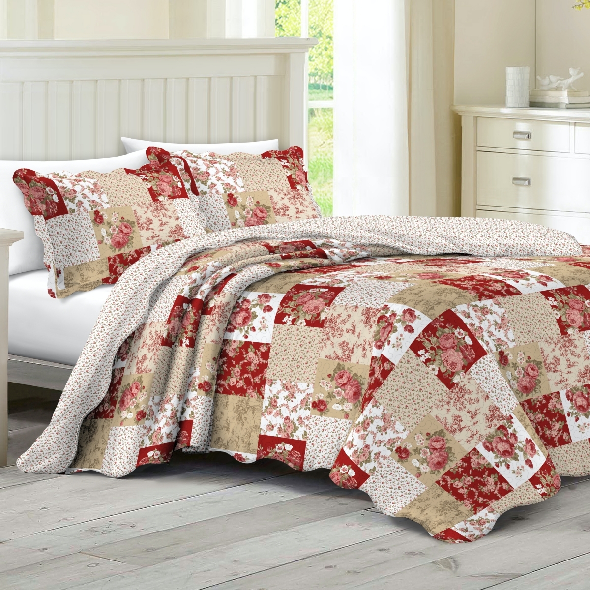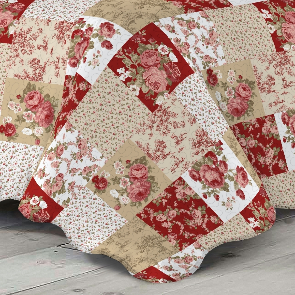 Přehoz na manželskou postel v sadě s povlaky na dva polštáře, s motivem patchworku v červných barvách s růžemi