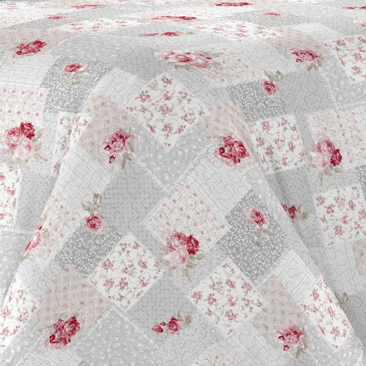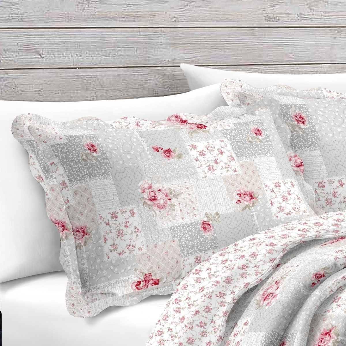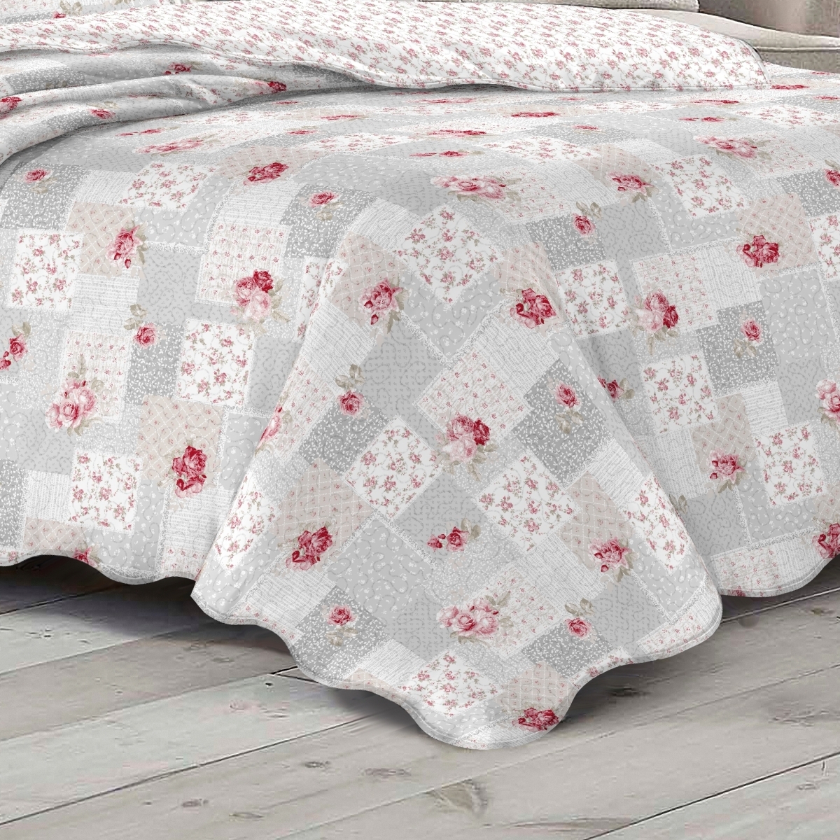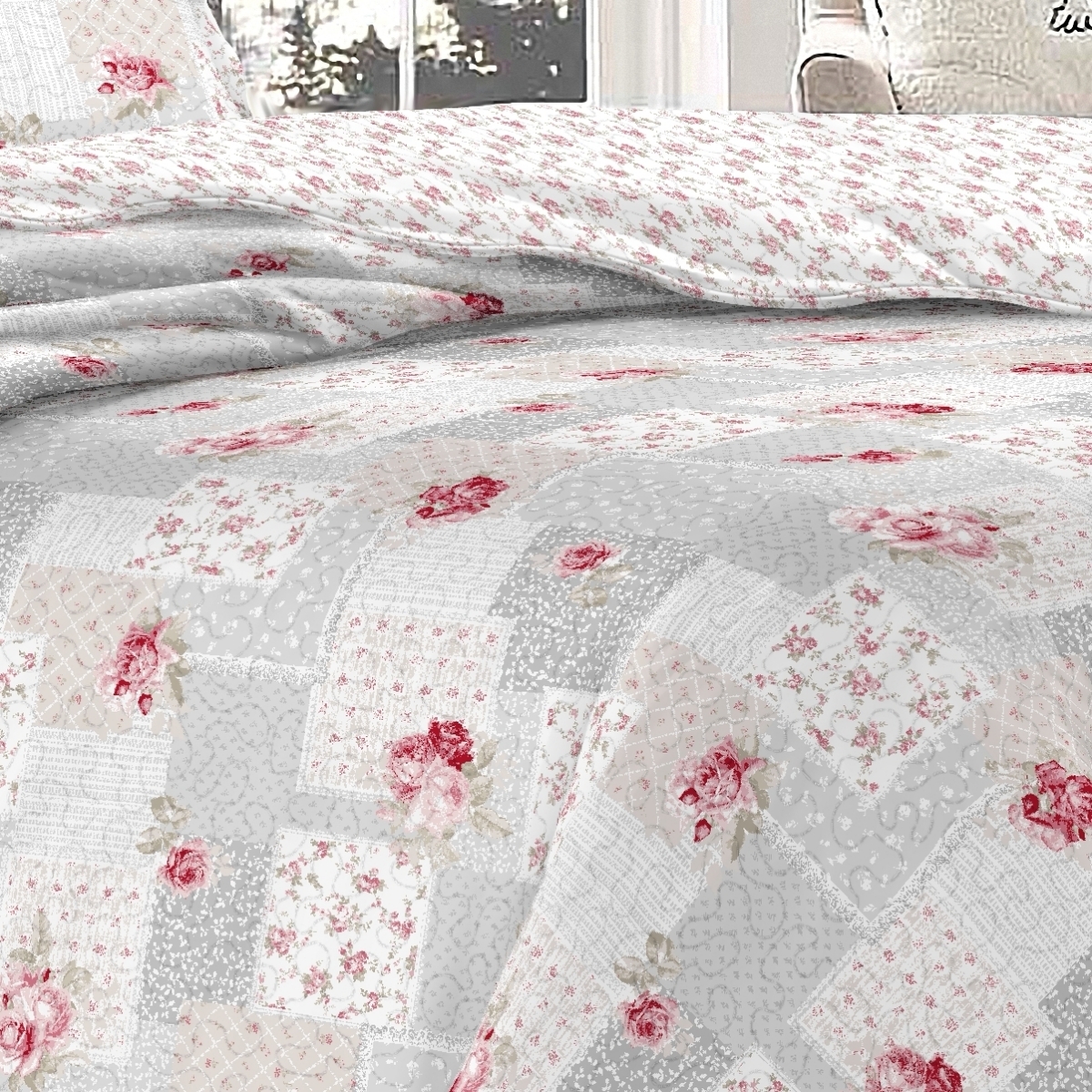 Přehoz na dvoulůžko se dvěma povlaky na polštáře v motivu v šedé barvě s růžovými růžemi