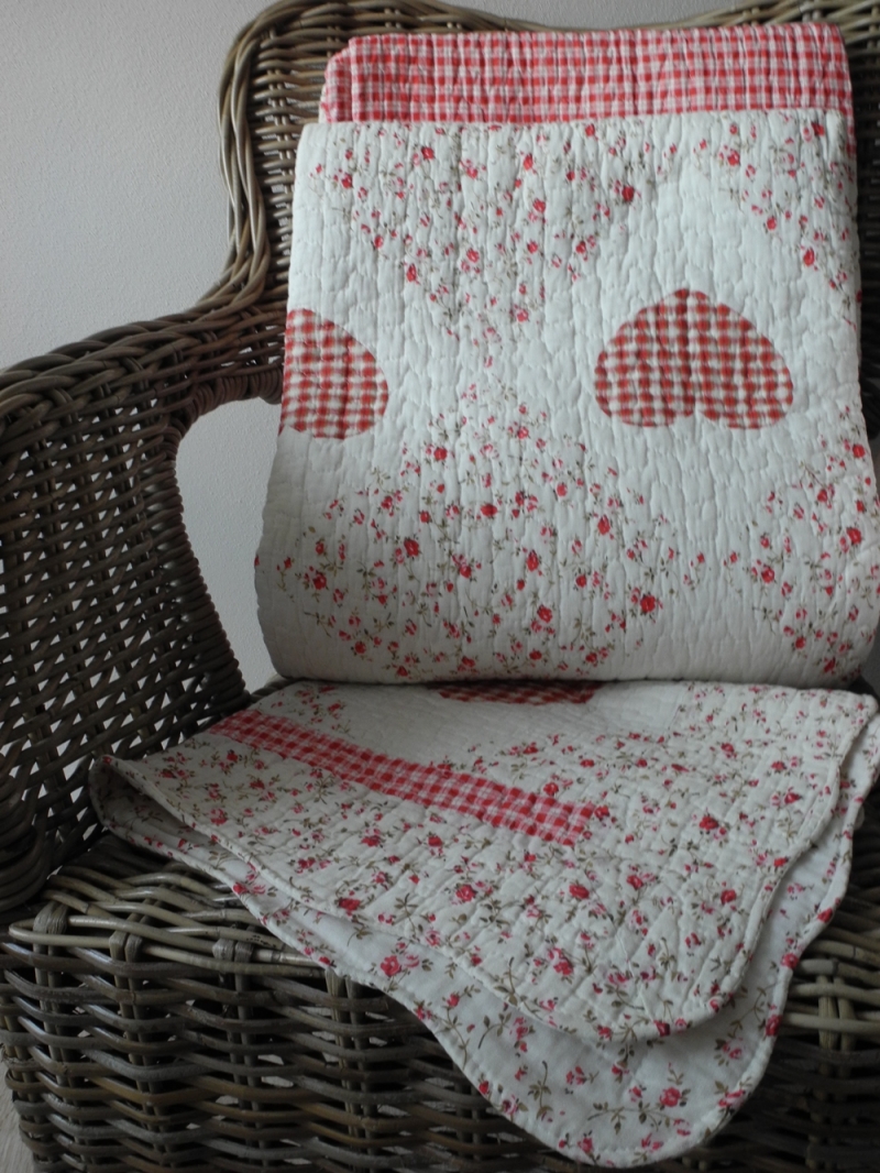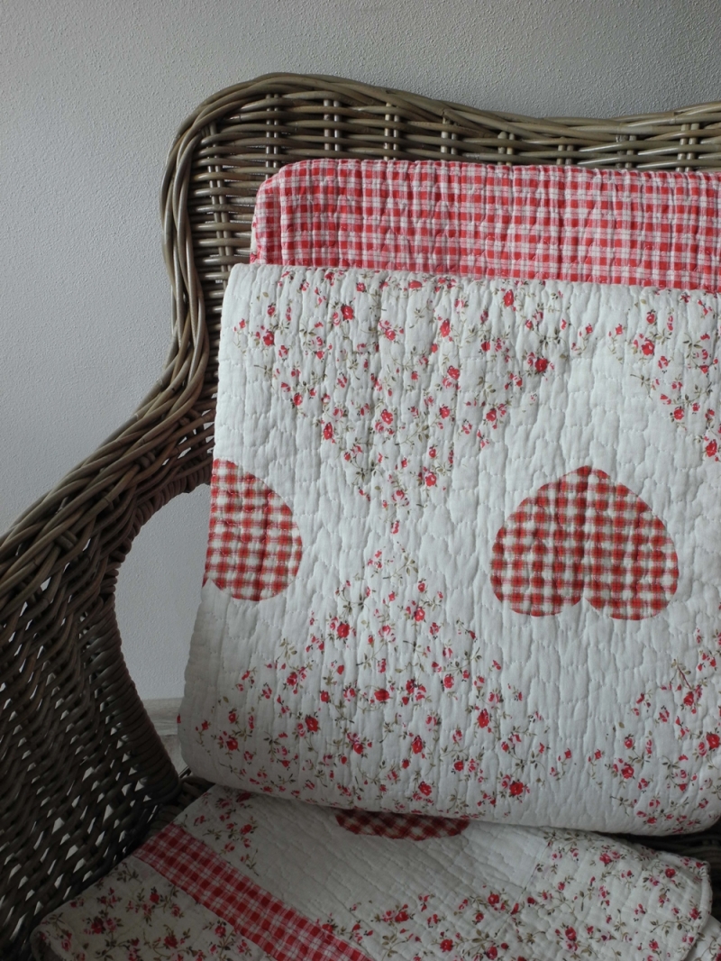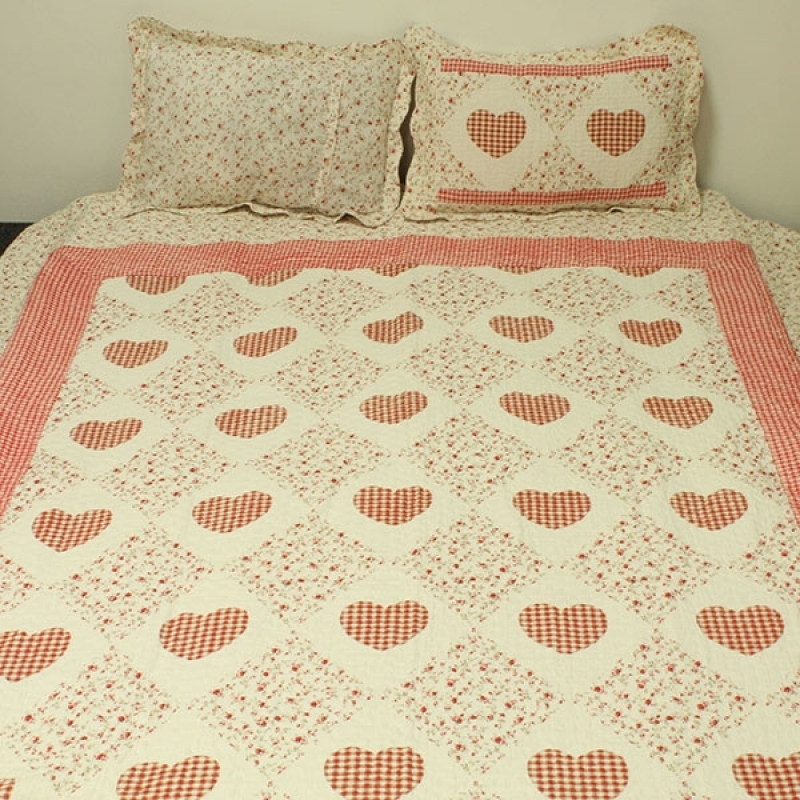 Přehoz na dvoulůžko patchwork + 2 povlaky na polštáře růžové srdce