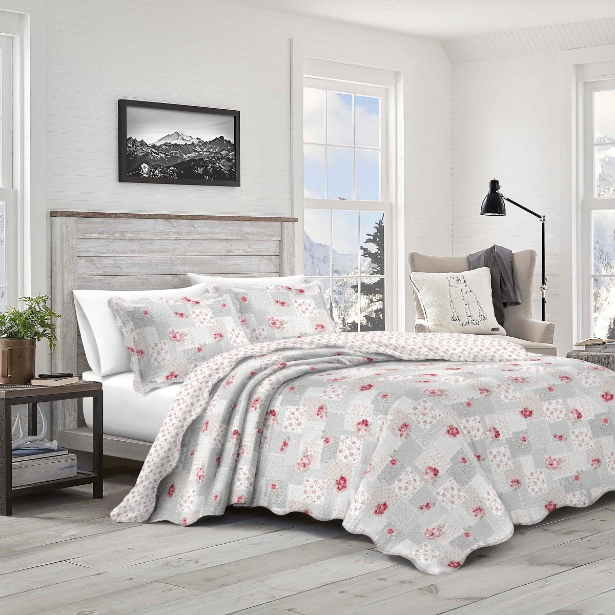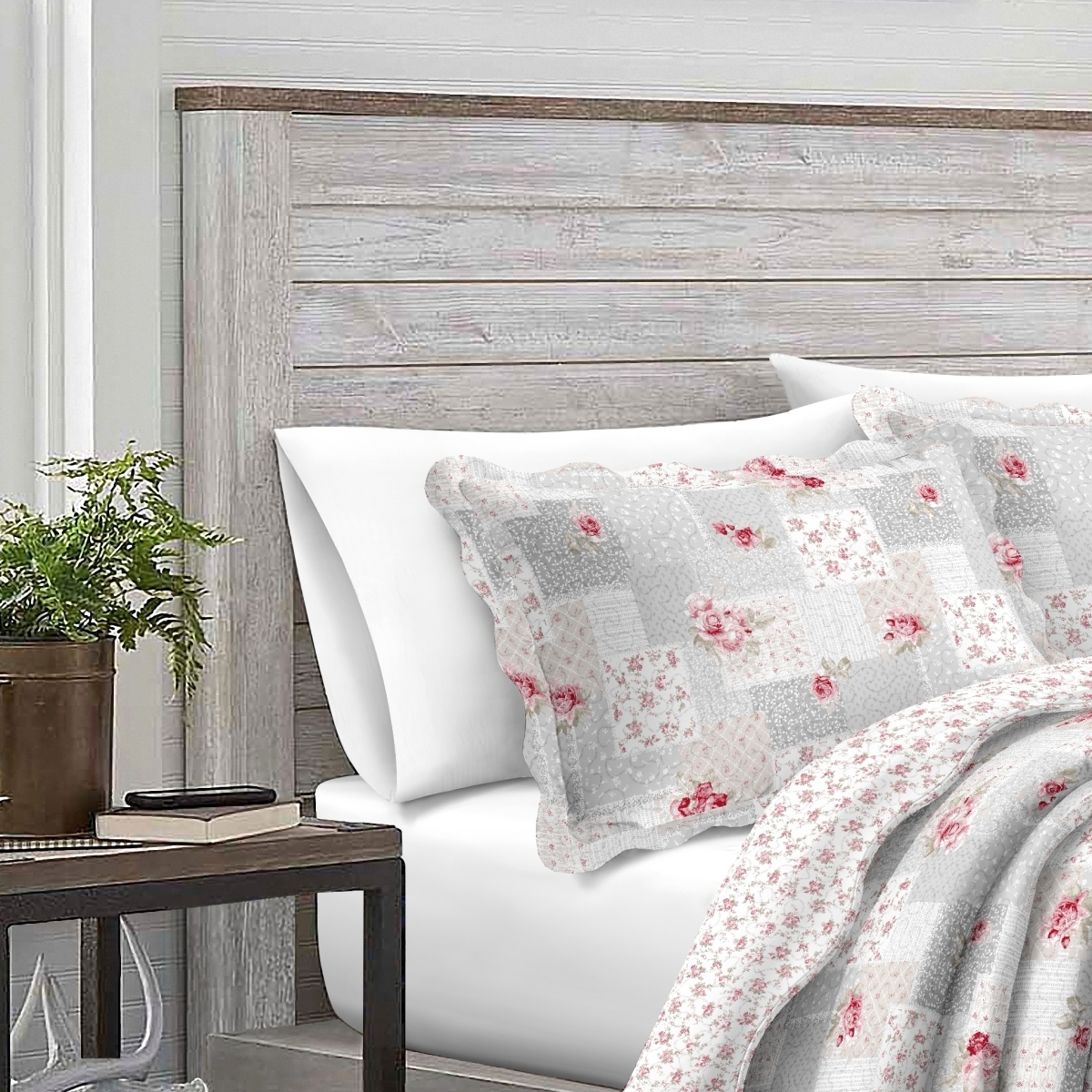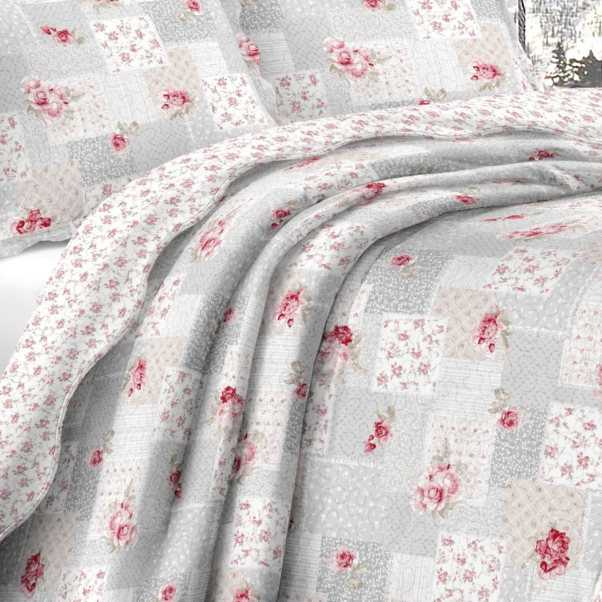 Přehoz na postel (jednolůžko) s povlakem na jeden polštář, s motivem v šedé barvě s růžovými růžemi
