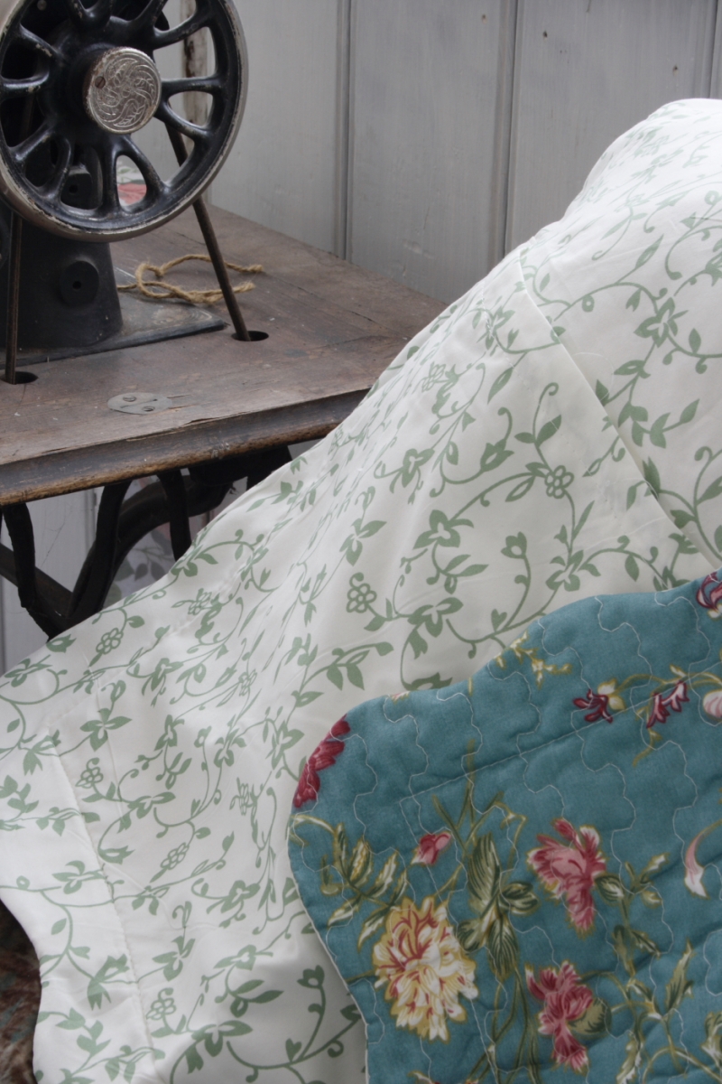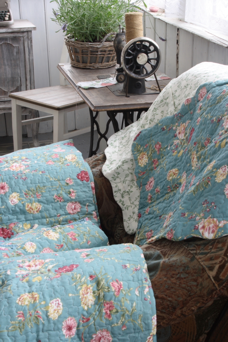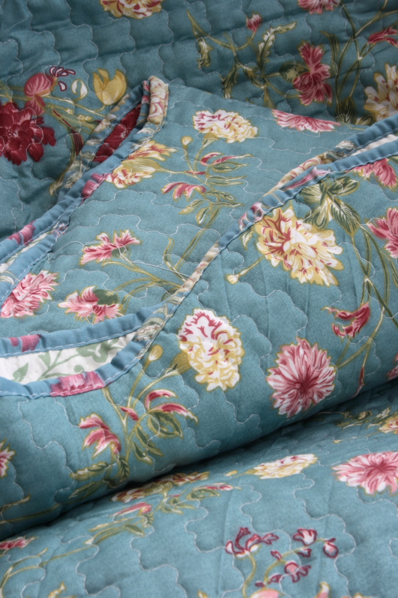 Praktický přehoz na postel schování peřiny a dodá ložnici romantický nádech. Přehoz má tlumenou modro-šedou barvu a je posetý květy karafiátu. K přehozu patří i dva povlaky na polštáře.
