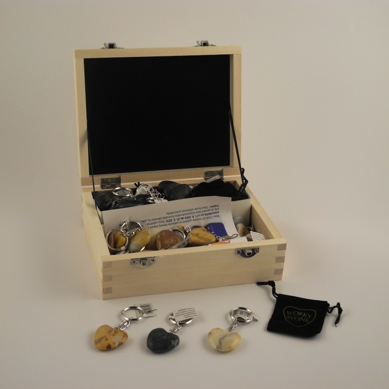 Dřevěná krabička o rozměrech 20x17x9cm s přihrádkami, obsahuje 36 kusů dárkových kamenných srdíček a 36 sametových pytlíčků se srdíčkem. Cena za celou krabici obsahující 36 sad je 875Kč