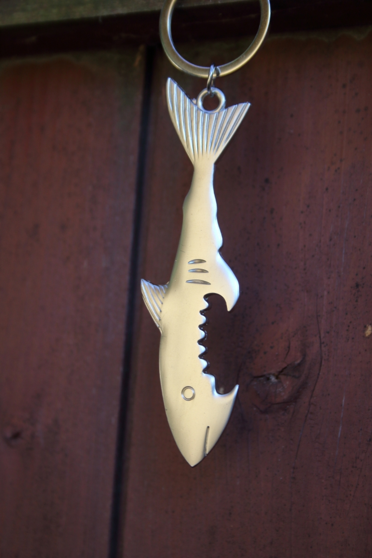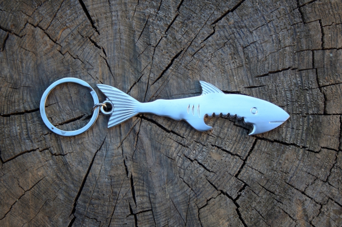 Přívěsek na klíče s motivem žraloka sloužící jako otvírák