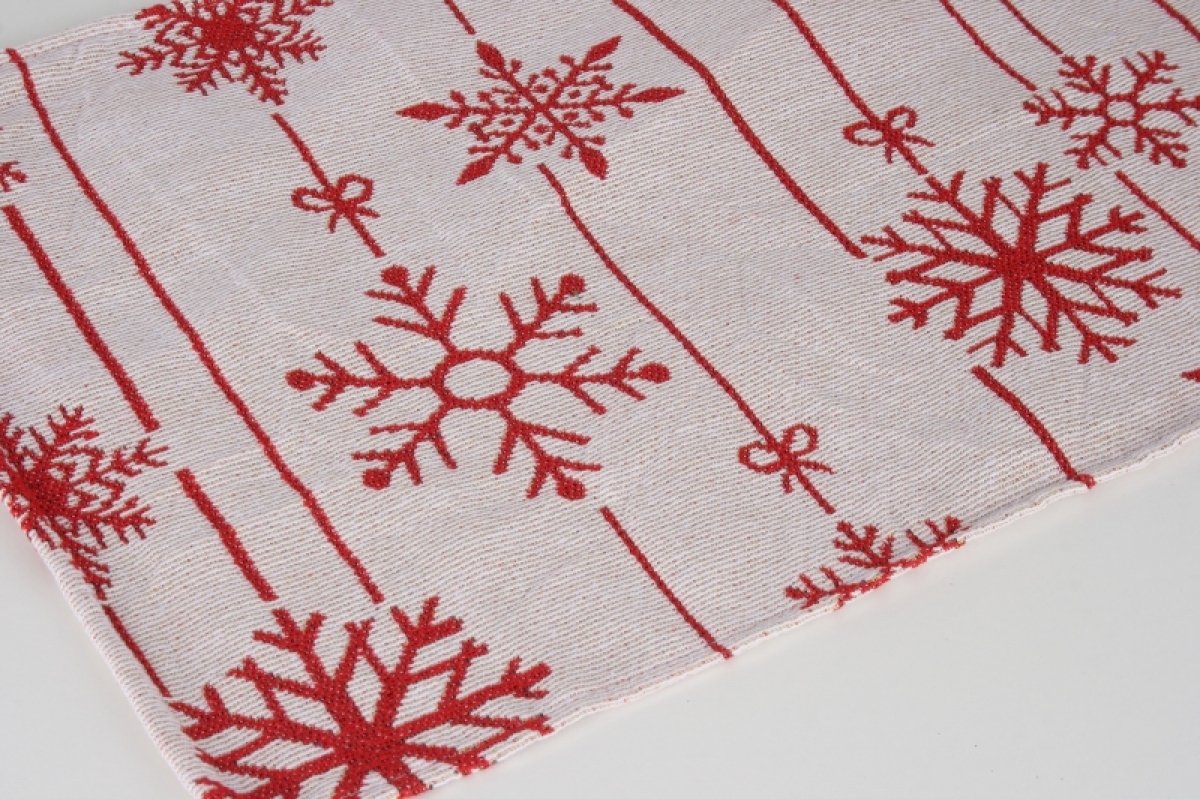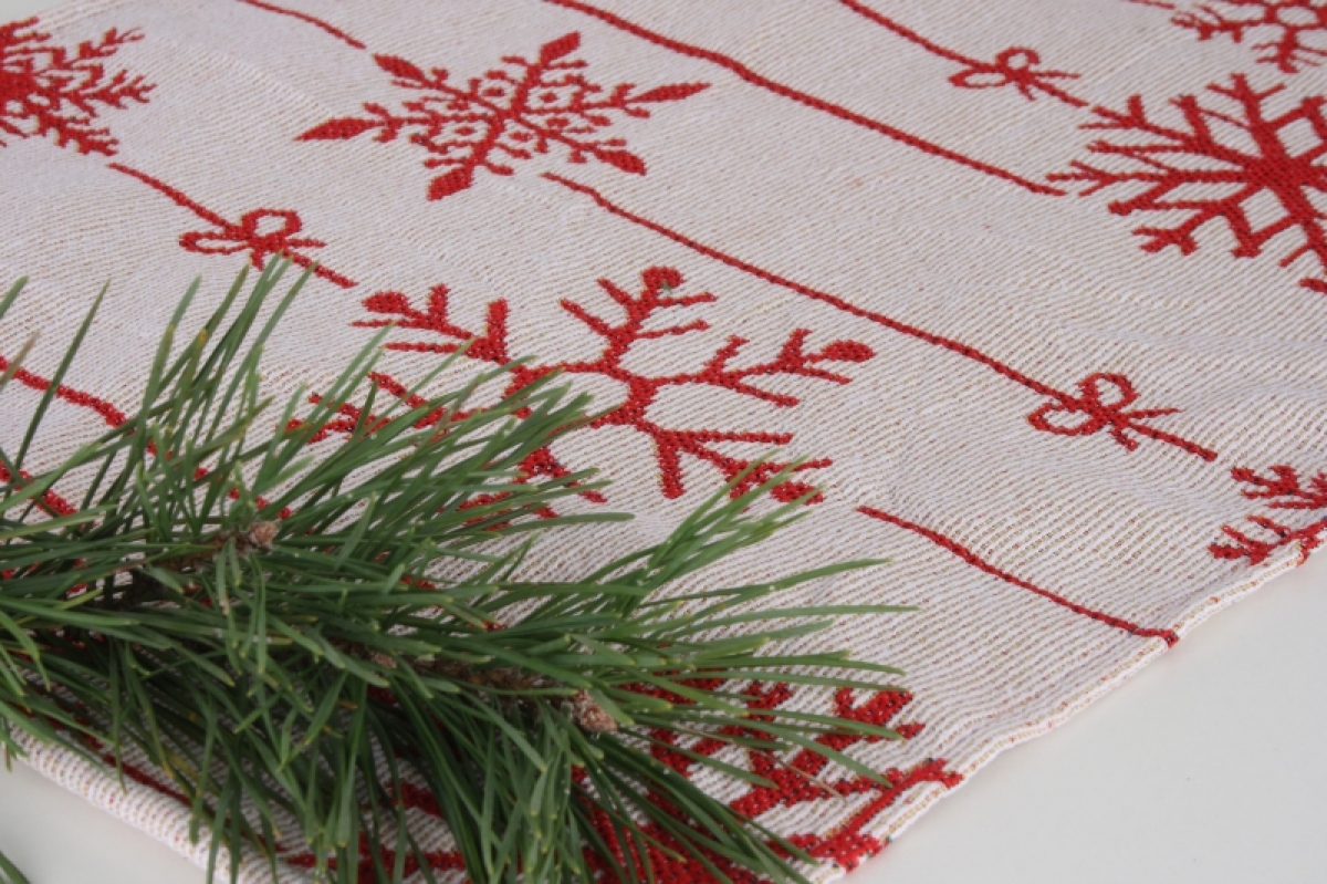 Prostírání s motivem červených vloček jistě patří na slavnostně prostřený stůl. Stejně tak bude krásně vypadat na staré komodě nebo truhlici ve Vaší chalupě.