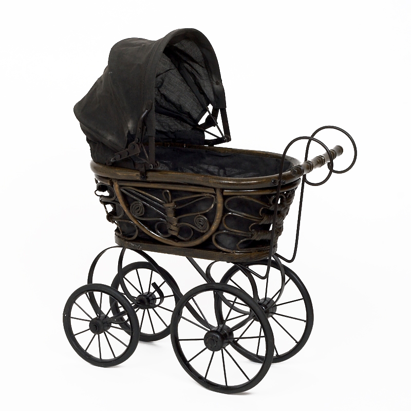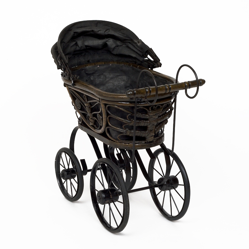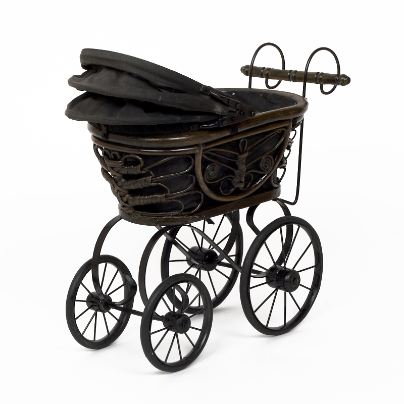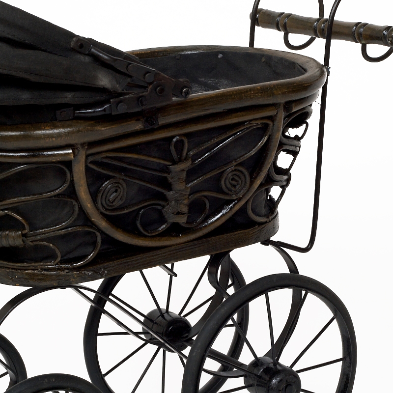 Celkové rozměry kočárku jsou výška 47cm, šířka 21cm a hloubka 39cm. Alternativní názvy: kočárek, kočár, z proutí, starodávný, retro.