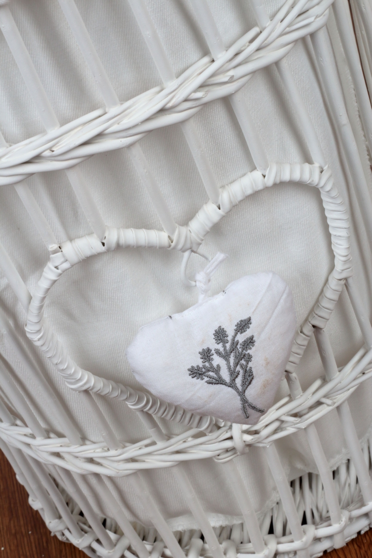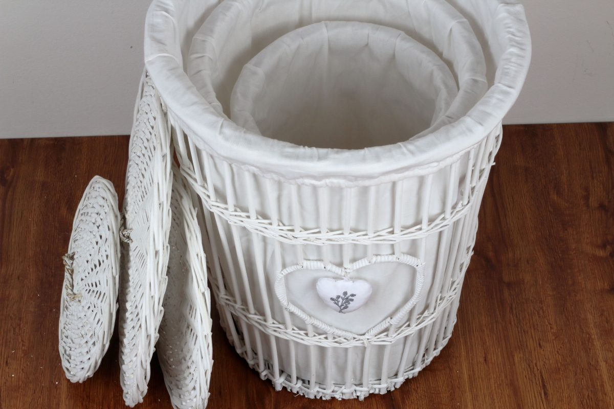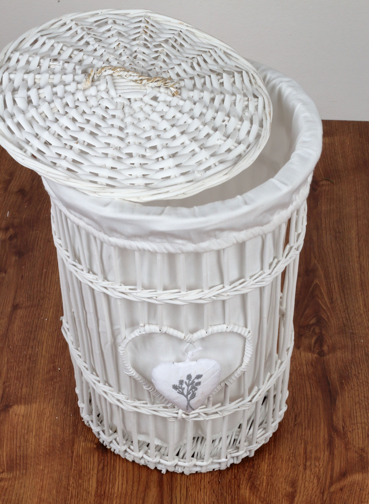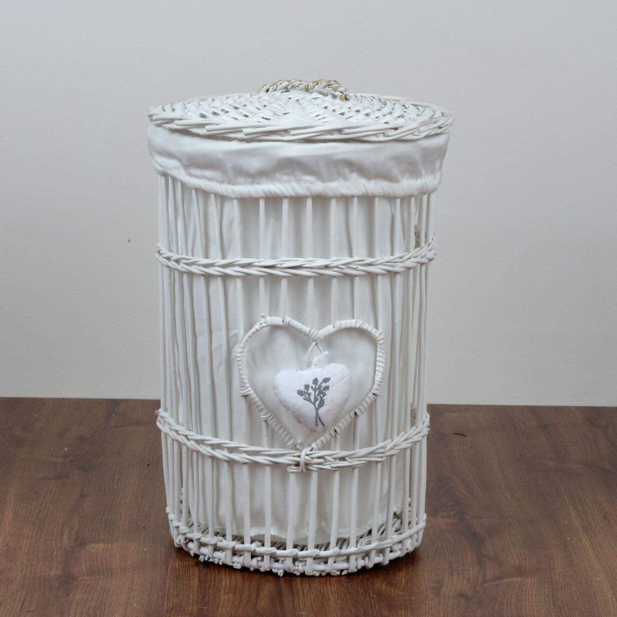 Proutěný koš na prádlo bílý levandulové srdce 45cm elegantním způsobem ukryje špinavé prádlo a stane se součástí jakéhokoliv venkovsky zařízeného pokoje nebo koupelny.