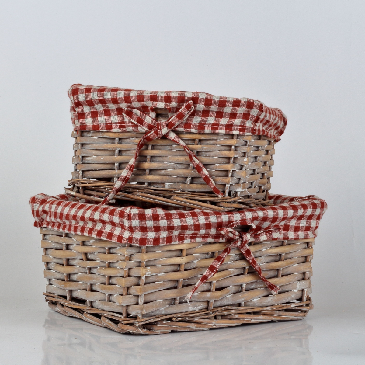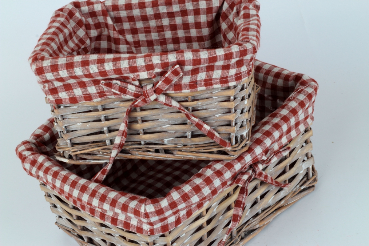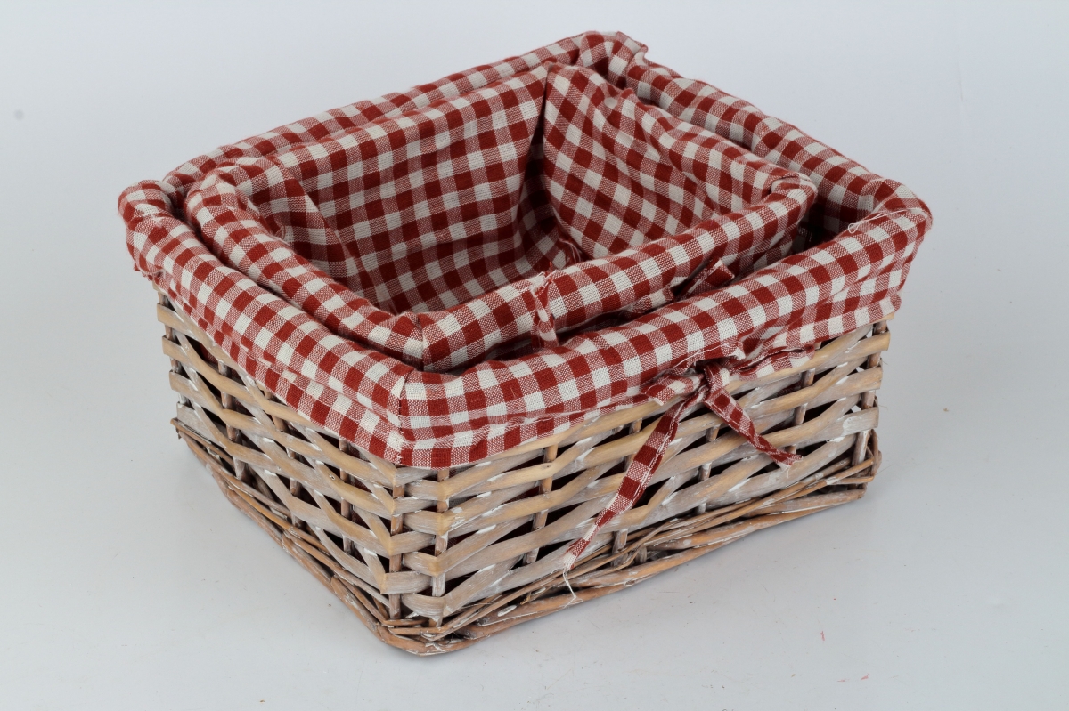 Proutěný košík červený 20x15x11cm je vystlaný károvanou červenou látkou, stálicí, která by neměla chybět v žádné chalupě.