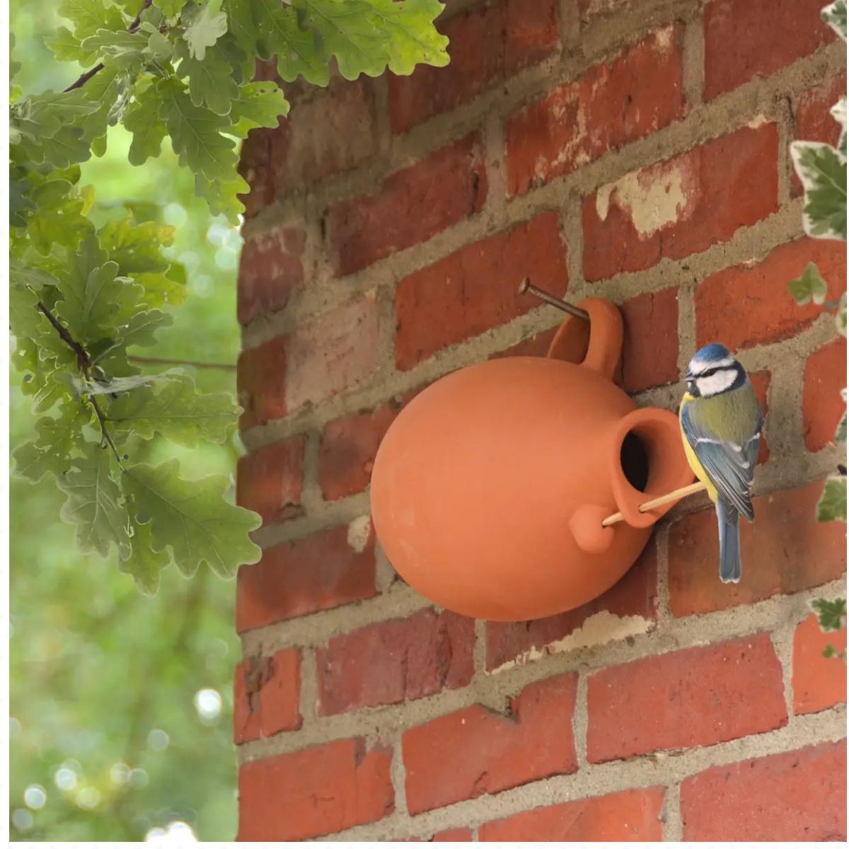 Ptačí budka v podobě kameninového džbánu s malým dřevěným bidýlkem