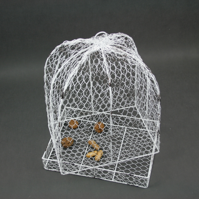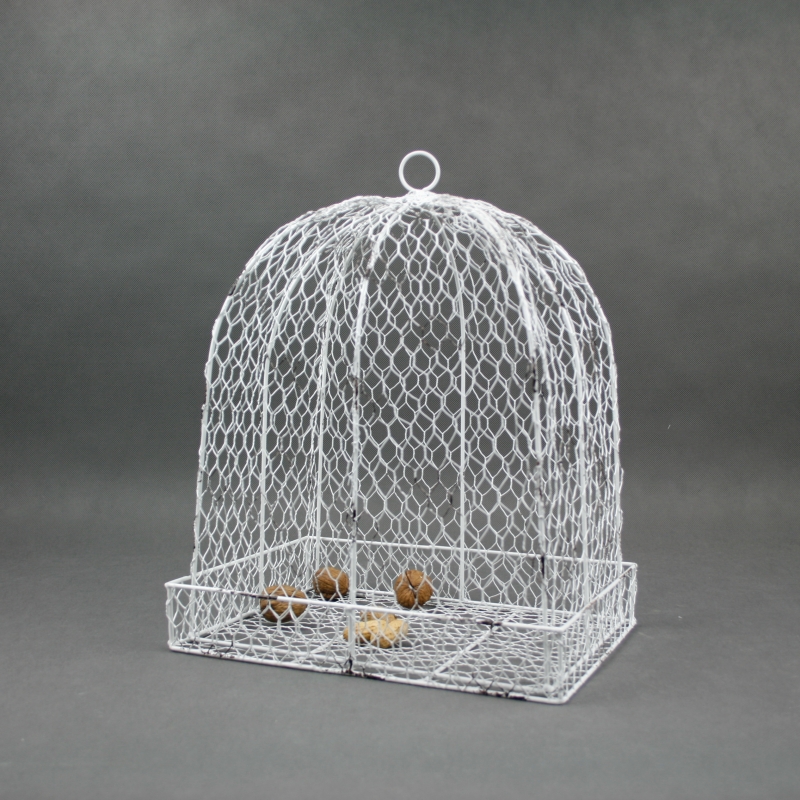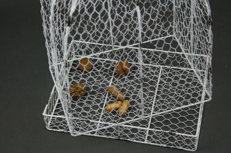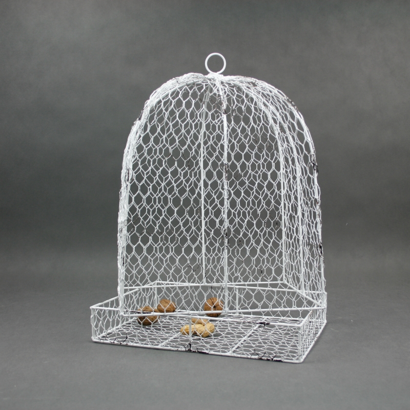 Ptačí klec je vyrobena z drátěného pletiva. Klec je zvláštní tím, že nemá dvířka - skládá se ze dvou částí (dno, poklop).