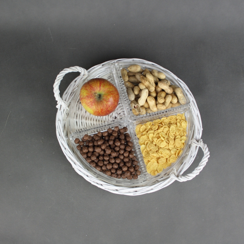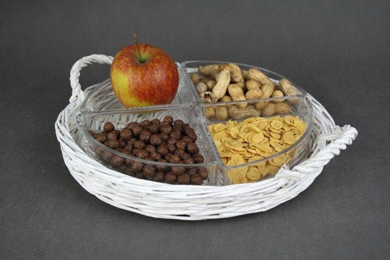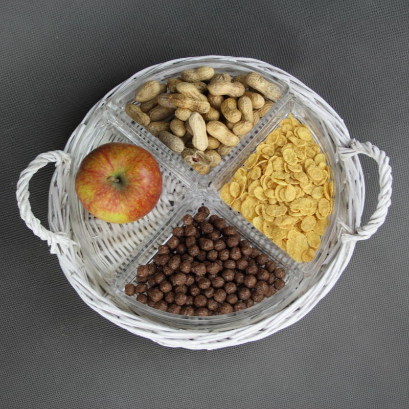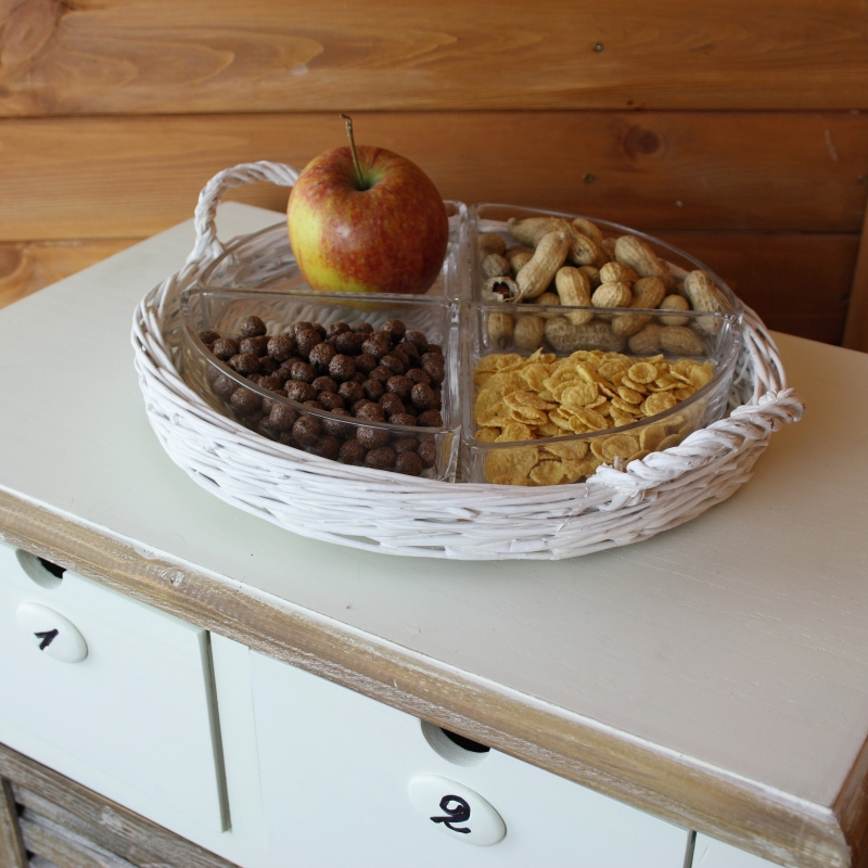 Ratanový podnos se zalíbí každému, kdo rád mlsá. Podnos má čtyři skleněné misky, které lze jednoduše vyndat a umýt. Můžete tedy mlsounům podstrojovat vše co mají rádi - oříšky slané i sladké, zdravá semínka nebo různé drobné sladkosti.