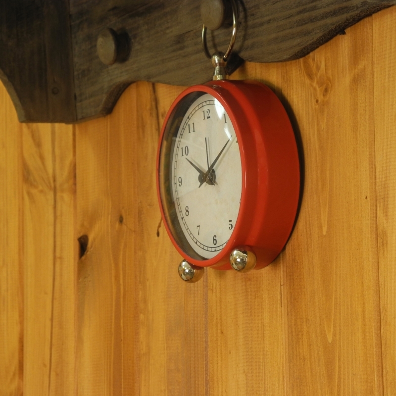Retro budík o průměru 11 cm má výšku 18 cm a hloubku 4 cm. Plášť budíku je kovový a zaujme jasnou červenou barvou. Elektronické buzení pípáním je další vlastností tohoto budíku s arabskými číslicemi.