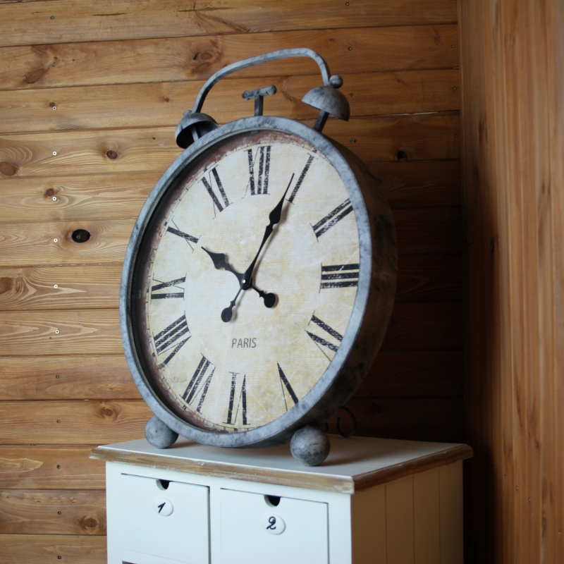 Retro hodiny mají velmi originální tvar klasického - velmi hlučného - budíku. Hodiny jsou kovové v šedé barvě s bílou patinou. Ciferník je zdoben velkými římskými číslicemi.