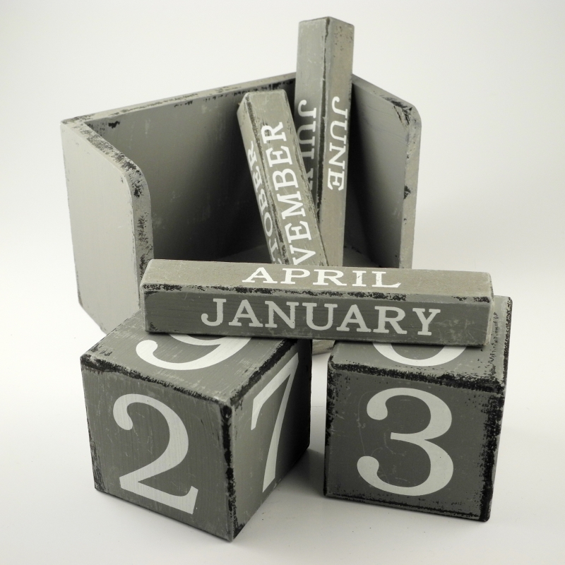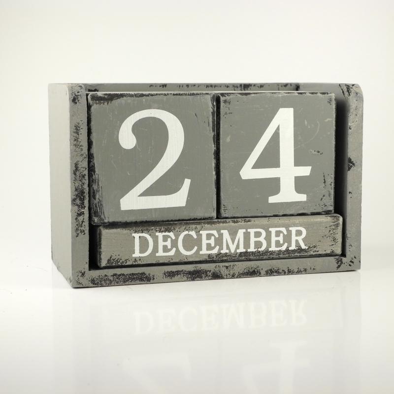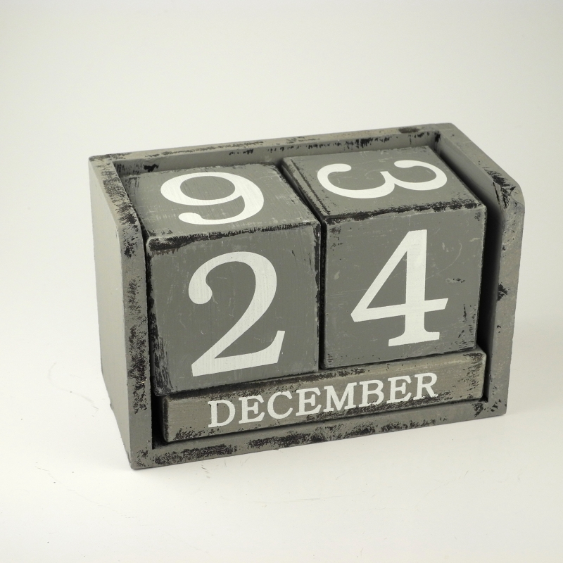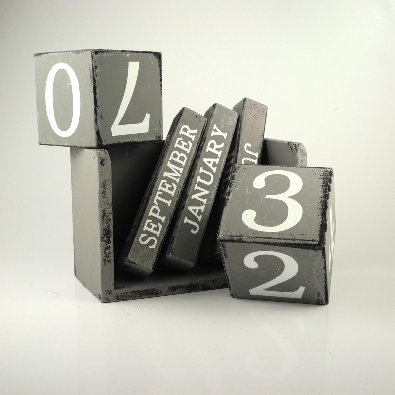 Retro kalendář dřevěný. Dřevěný retro nekonečný kalendář lze nastavovat otáčením dřevěných kostek o rozměrech 7.5x7.5cm. Celkové rozměry výrobku: 18x9x12cm.