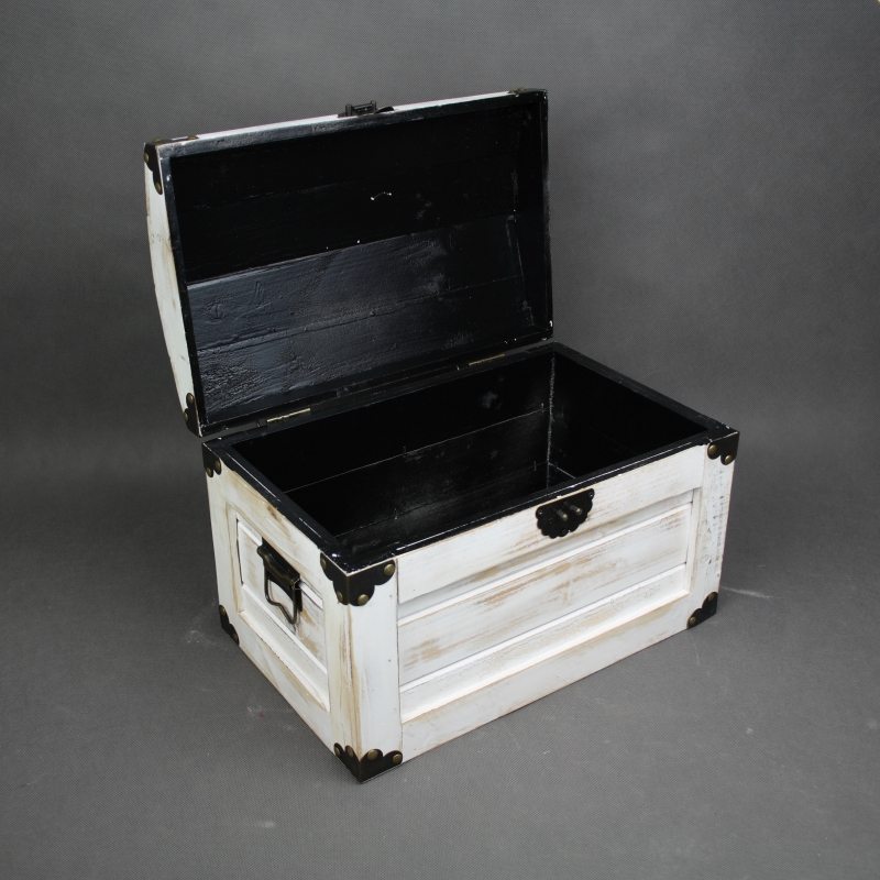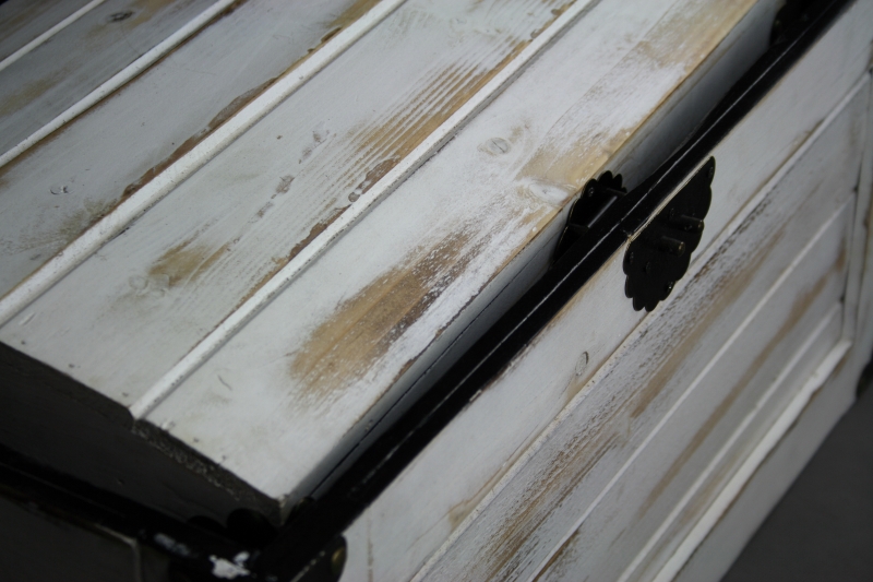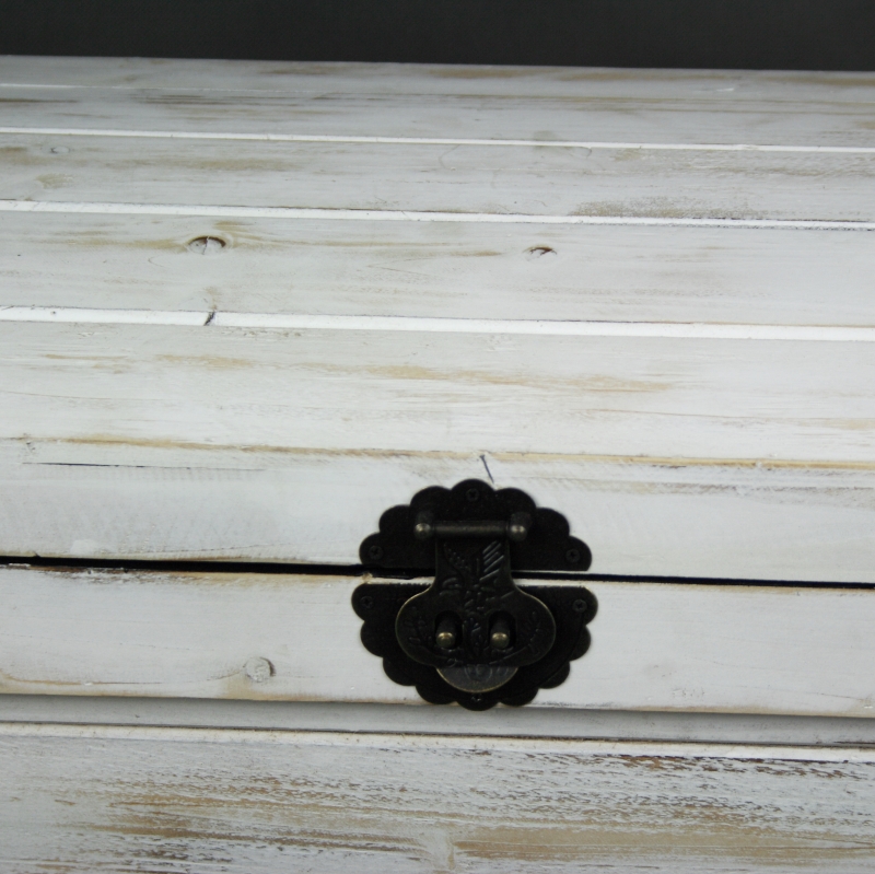 Kufr je ze světlého dřeva s patinou a má tmavé kování. Kované rozetky připomínají tvar kytek, který celý kufr dělá ještě zajímavějším.