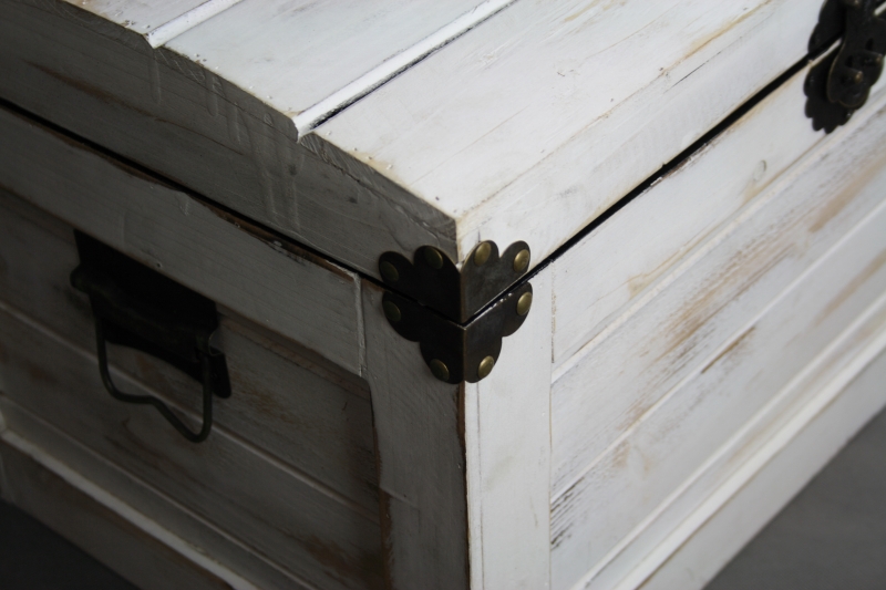 Kufr je ze světlého dřeva s patinou a má tmavé kování. Kované rozetky připomínají tvar kytek, který celý kufr dělá ještě zajímavějším.