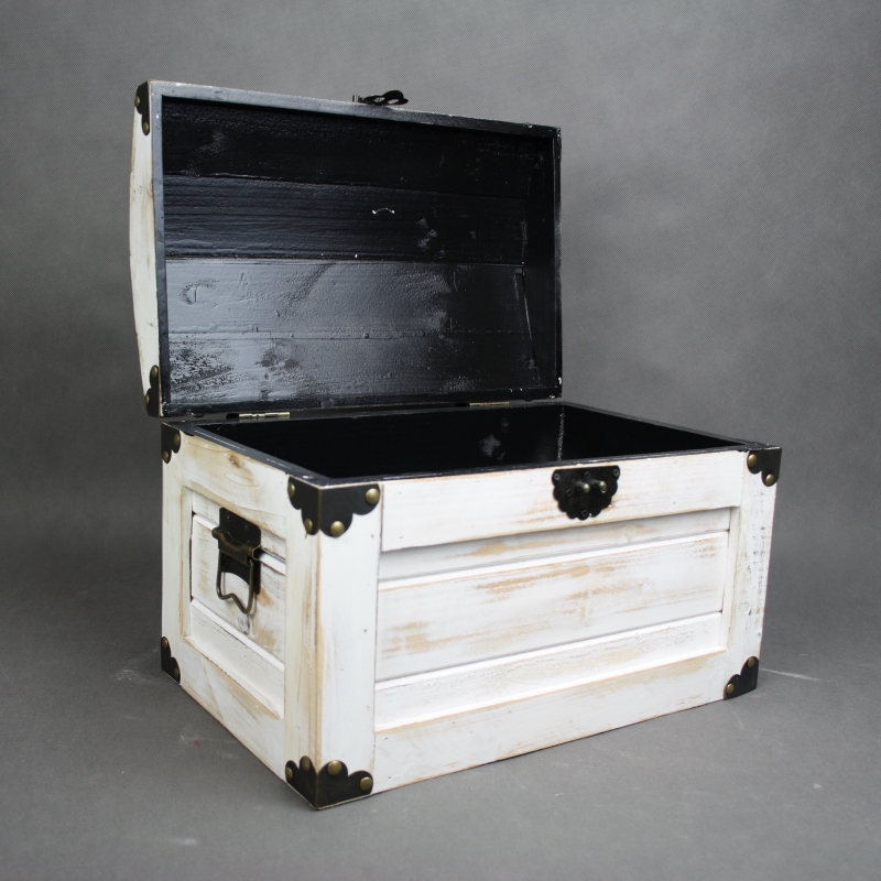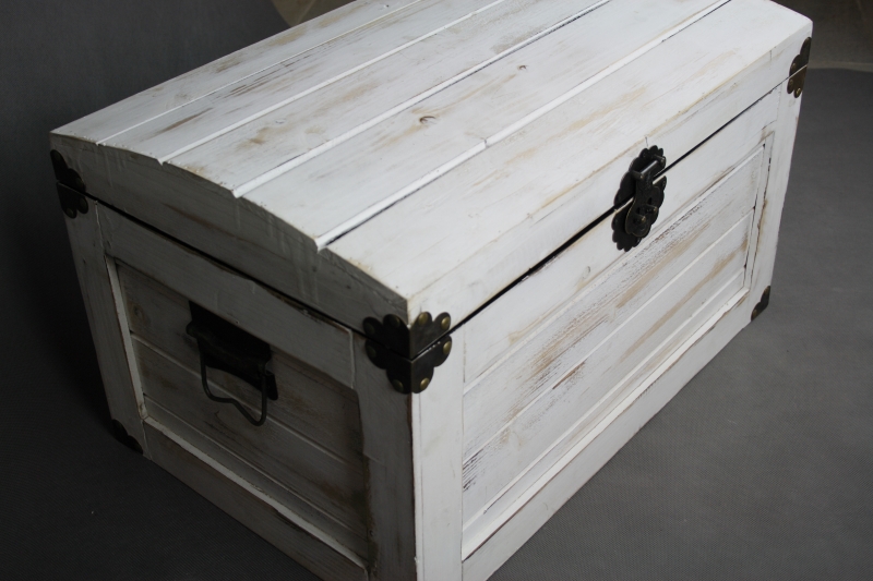 Kufr je ze světlého dřeva s patinou a má tmavé kování. Kované rozetky připomínají tvar kytek, který celý kufr dělá ještě zajímavějším.