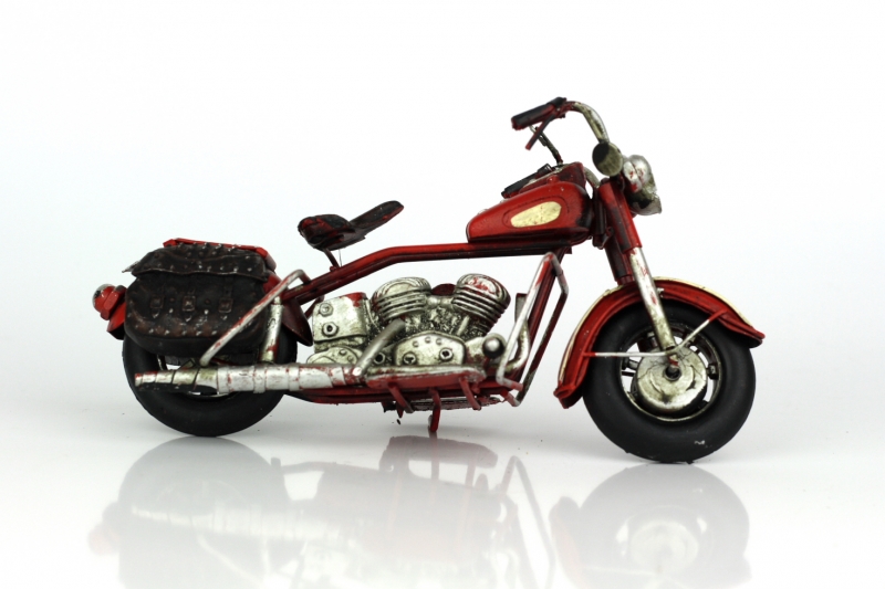 Tento kovový model má nepřehlédnutelnou jasně červenou barvu, v zadní části je doplněn o dvě brašny. Krásně vynikne na polici či komodě.