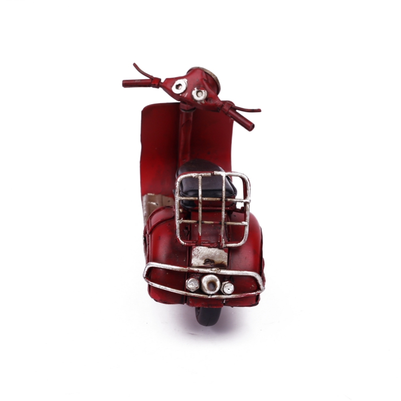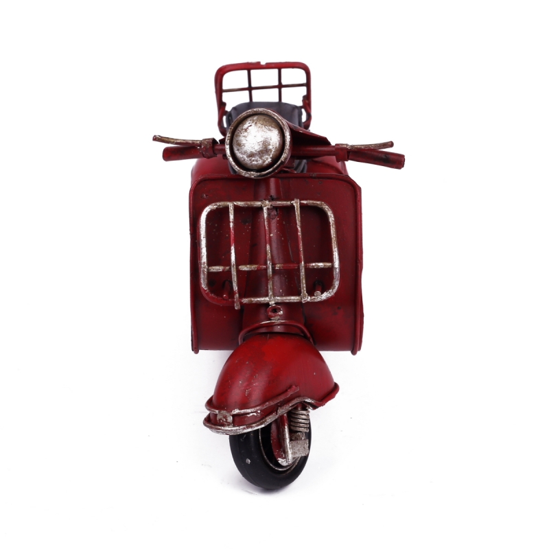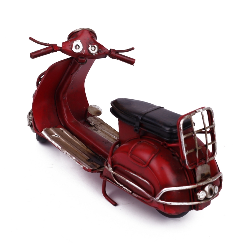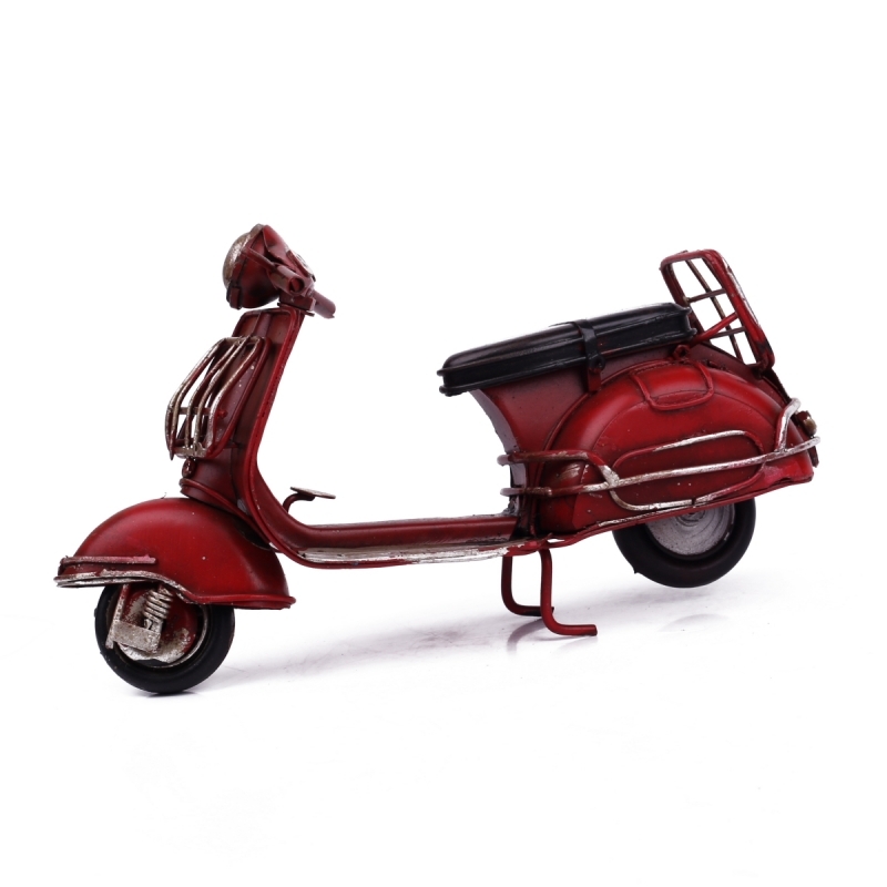 Tento kovový retro model skútru má krásnou temně rudou barvu, která Vás zaujme na první pohled.Model je velmi hezky propracovaný. Díky praktickému stojánku ho umístíte kamkoliv budete chtít.