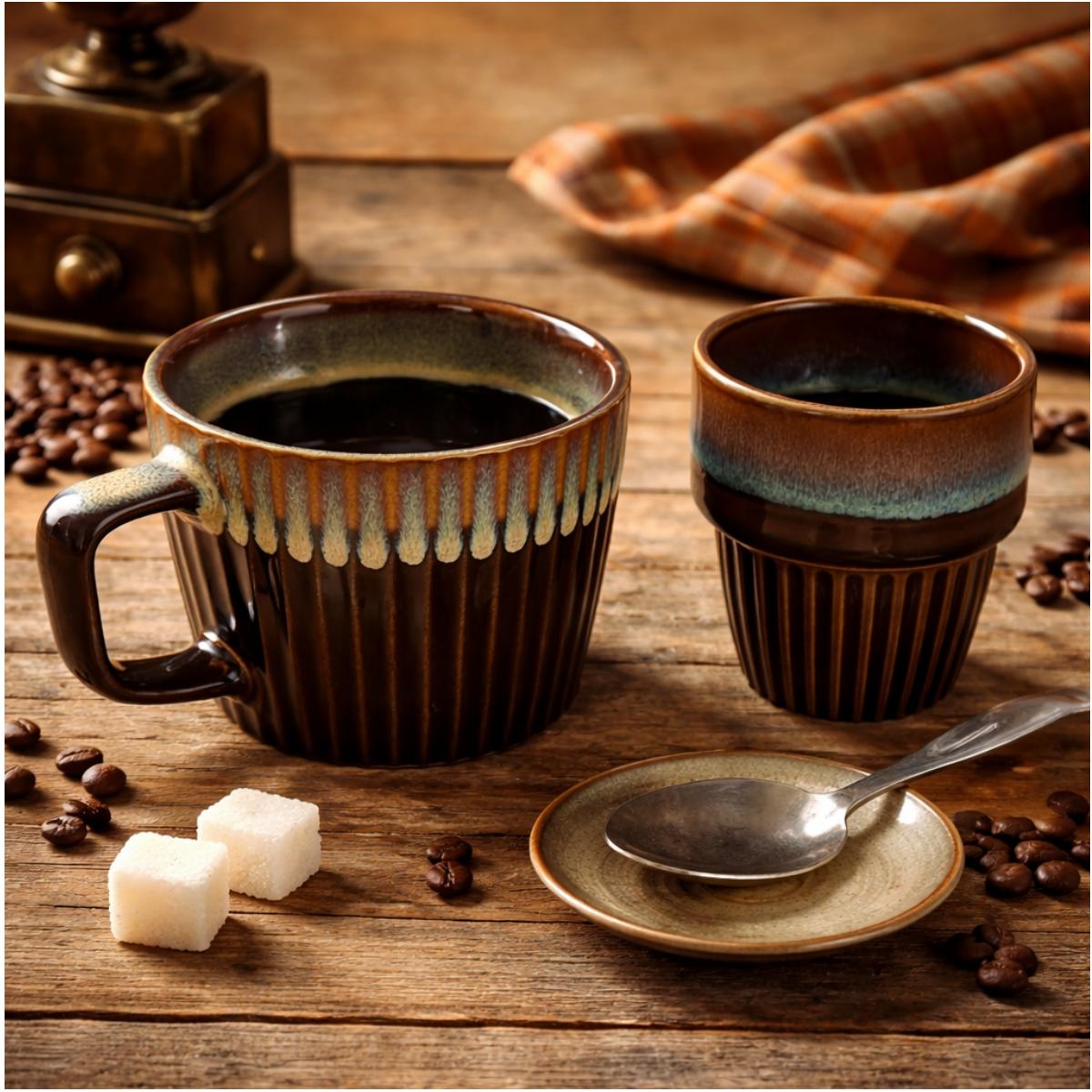 Retro sada 4 malých šálků na kávu ve stylu 70. a 80. let. V tehdejší době na turka s bohatým lógrem. Někdy se v tomto šálku zvládl uvařit i "druhák". Dnes 100ml spíše na espresso z kávovaru.