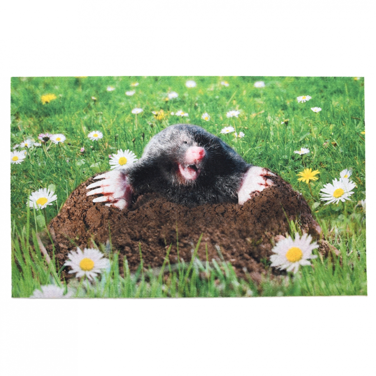 Pokud jste milovníky zvířat a rádi se bavíte, jistě se vám zalíbí tahle veselá rohožka s motivem doslova smějícího se krtka, právě vylézajícího ze země uprostřed louky s rozkvetlými sedmikráskami a pampeliškami.