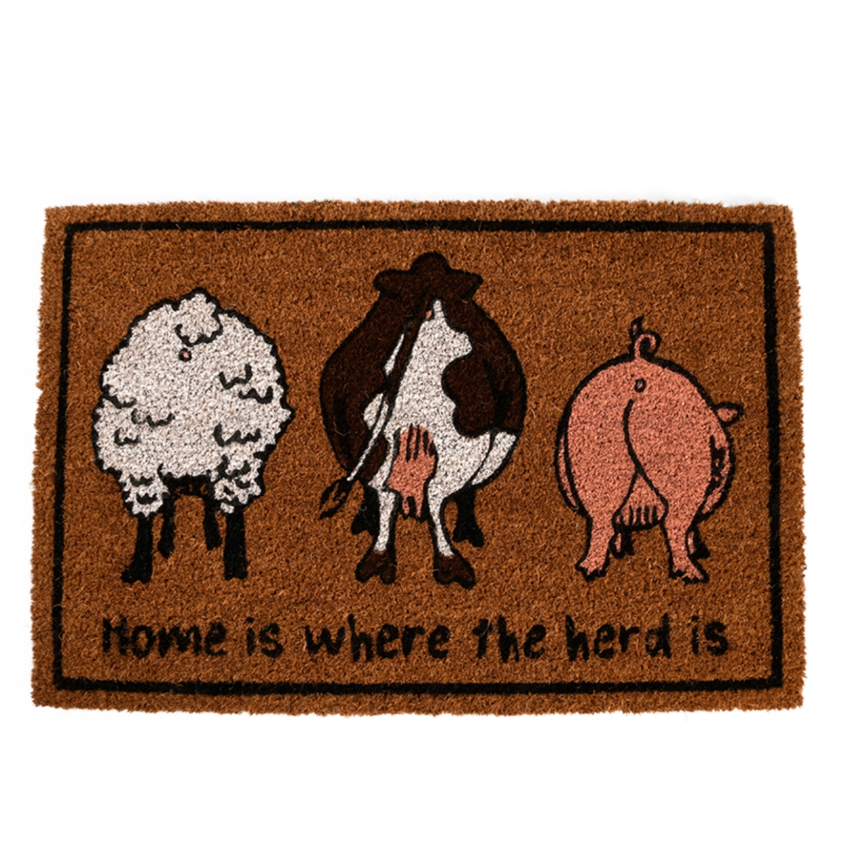 Tato rohožka, o rozměrech 40,4 x 61 cm, s vtipným barevným obrázkem pozadí ovečky, kravičky a prasátka, je určená pro opravdové milovníky zvířat a každé návštěvě jistě vyloudí úsměv na tváři.