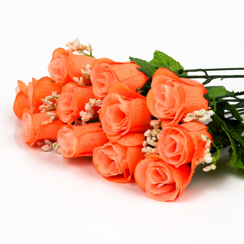 Růže oranžová 50cm s kapkami a bílou dekorací vypadá na kterémkoli stole prostě úžasně.