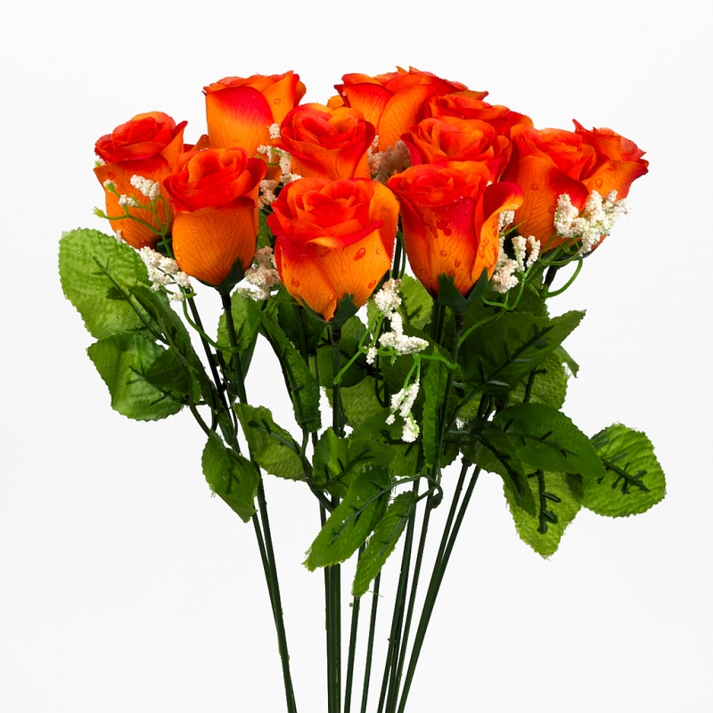 Růže oranžovo-červená 50cm s kapkami a bílou dekorací vypadá na kterémkoli stole prostě úžasně.