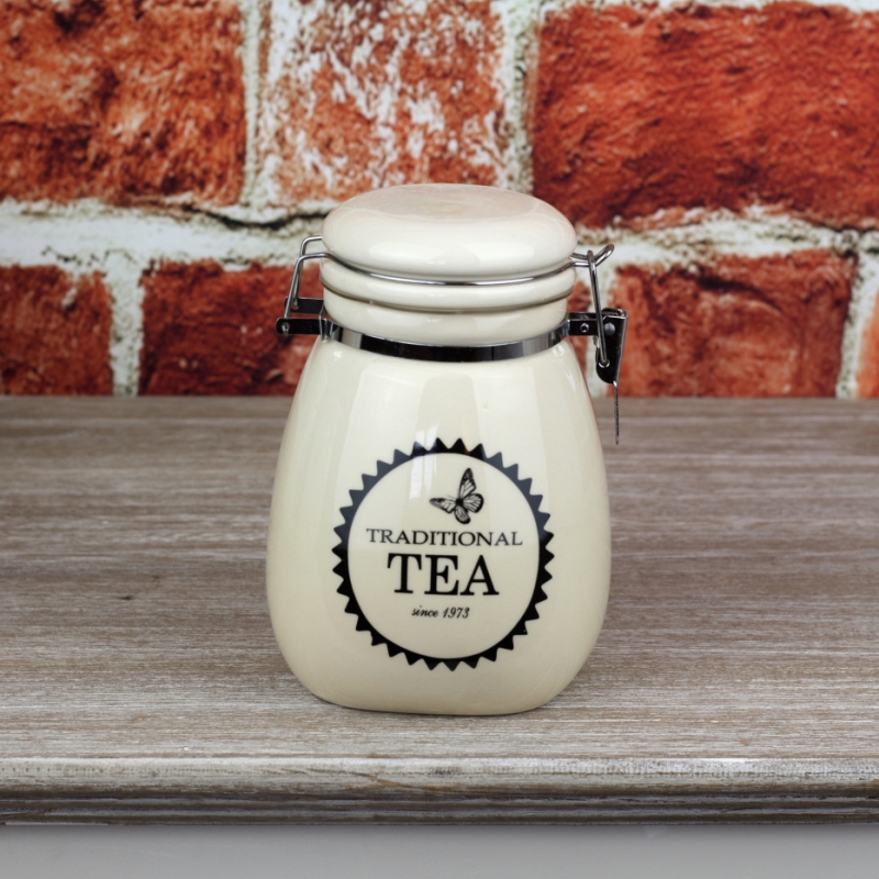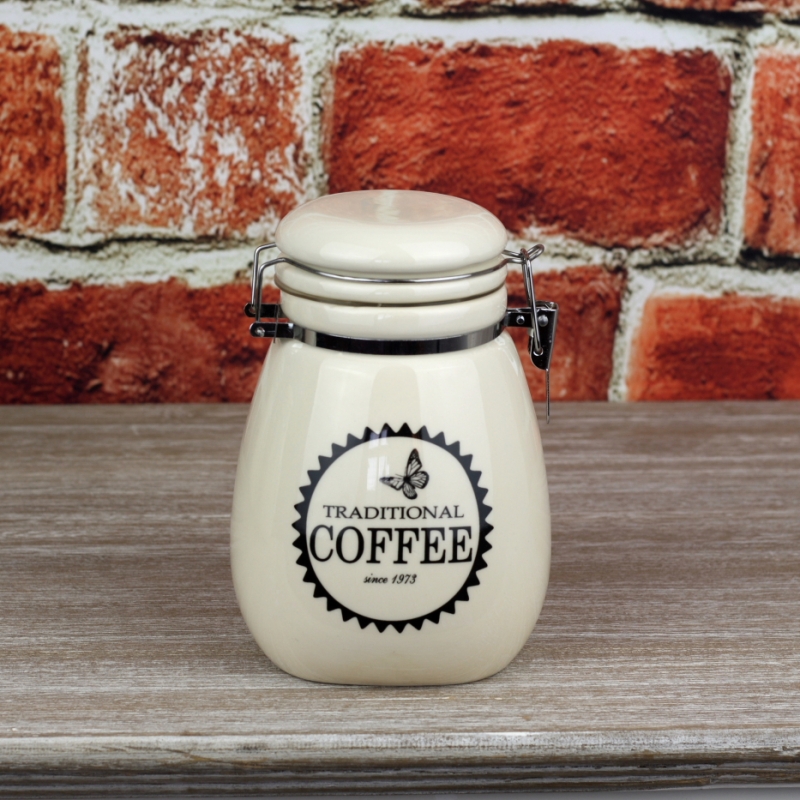 Dózy mají pákový uzávěr s těsněním. Jsou vyrobené z keramiky a na přední straně mají anglický nápis.
