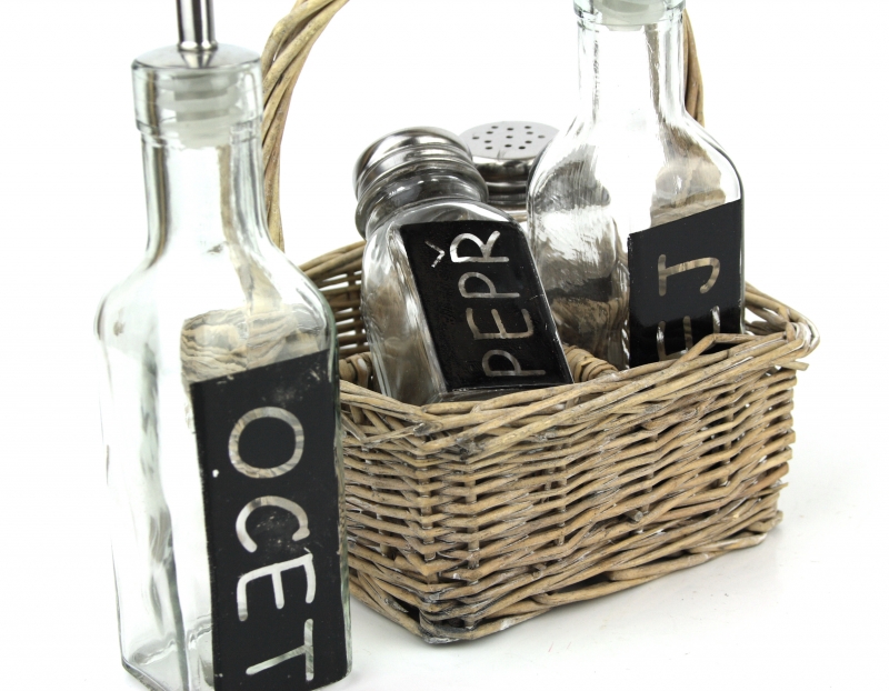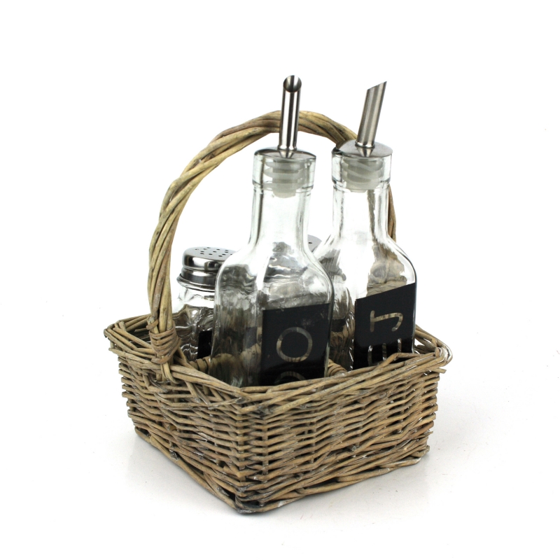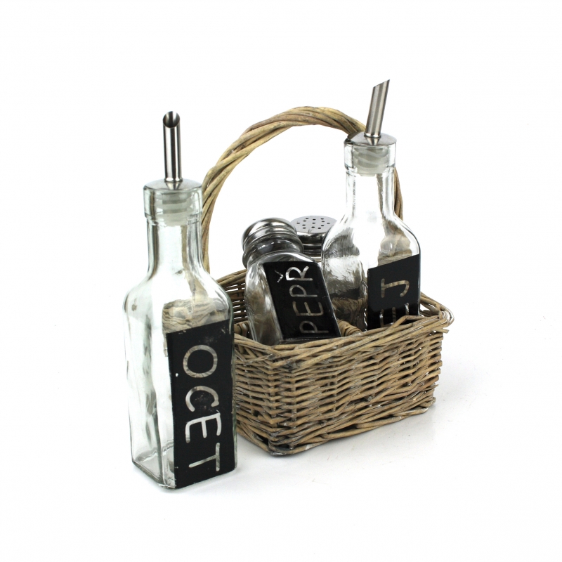 Velmi pěkná proutěná přenoska na koření a dochucovadla - sůl, pepř, olej a ocet.