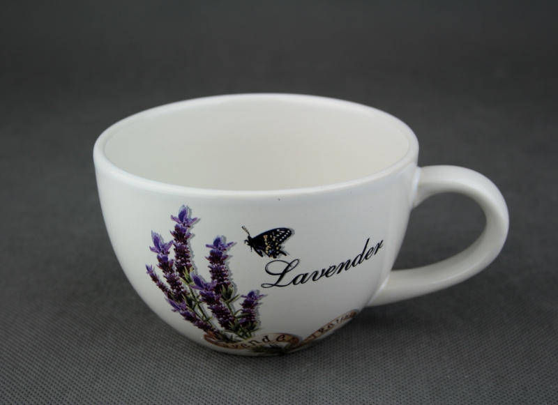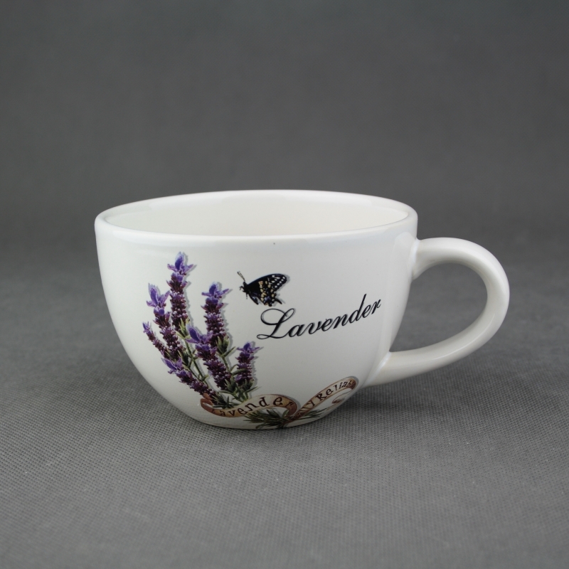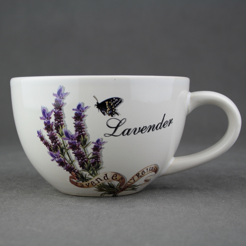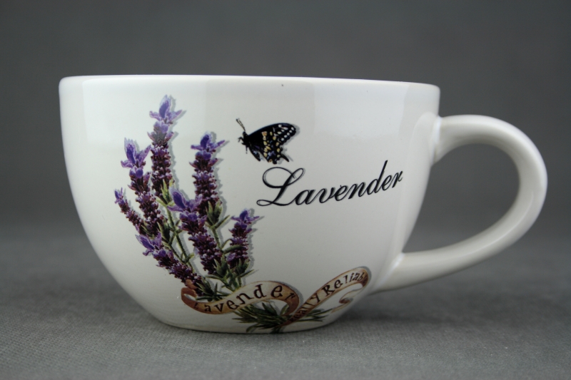 Šálek s motivem levandule a motýla.