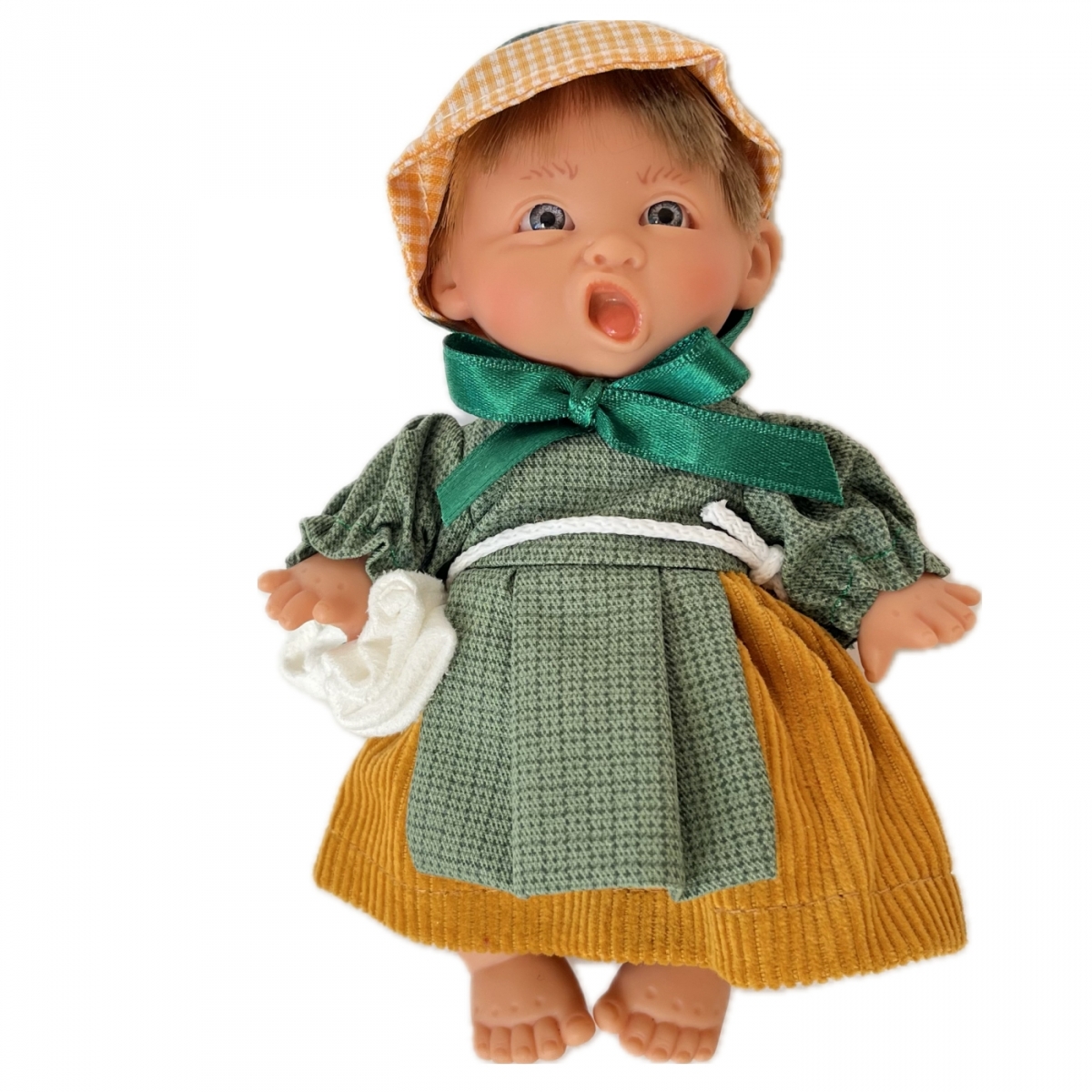 Děvče má šaty se zástěrou a zelenou mašlí. Na hlavě má čepec a kolem pasu pytlíček.