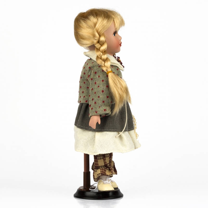 Panenka má šedé šatičky zdobené bílou podšívkou, která přesahuje spodní část sukně a pletenu vestičku. Nohy zdobí kárované kalhoty a na nohách má bílé šněrovací botičky.