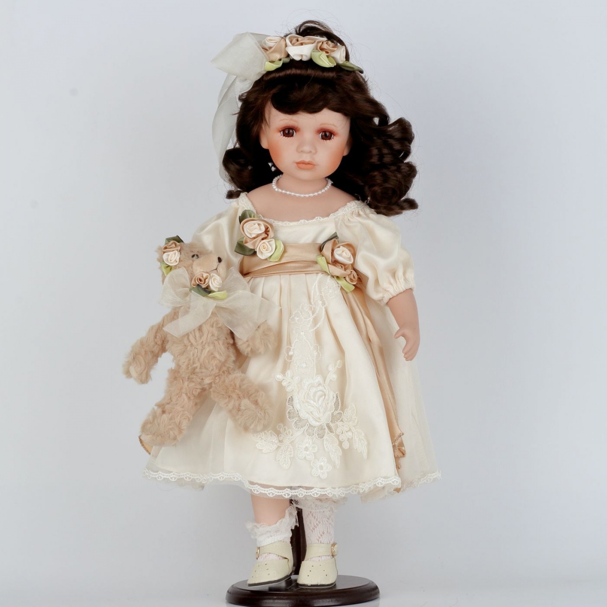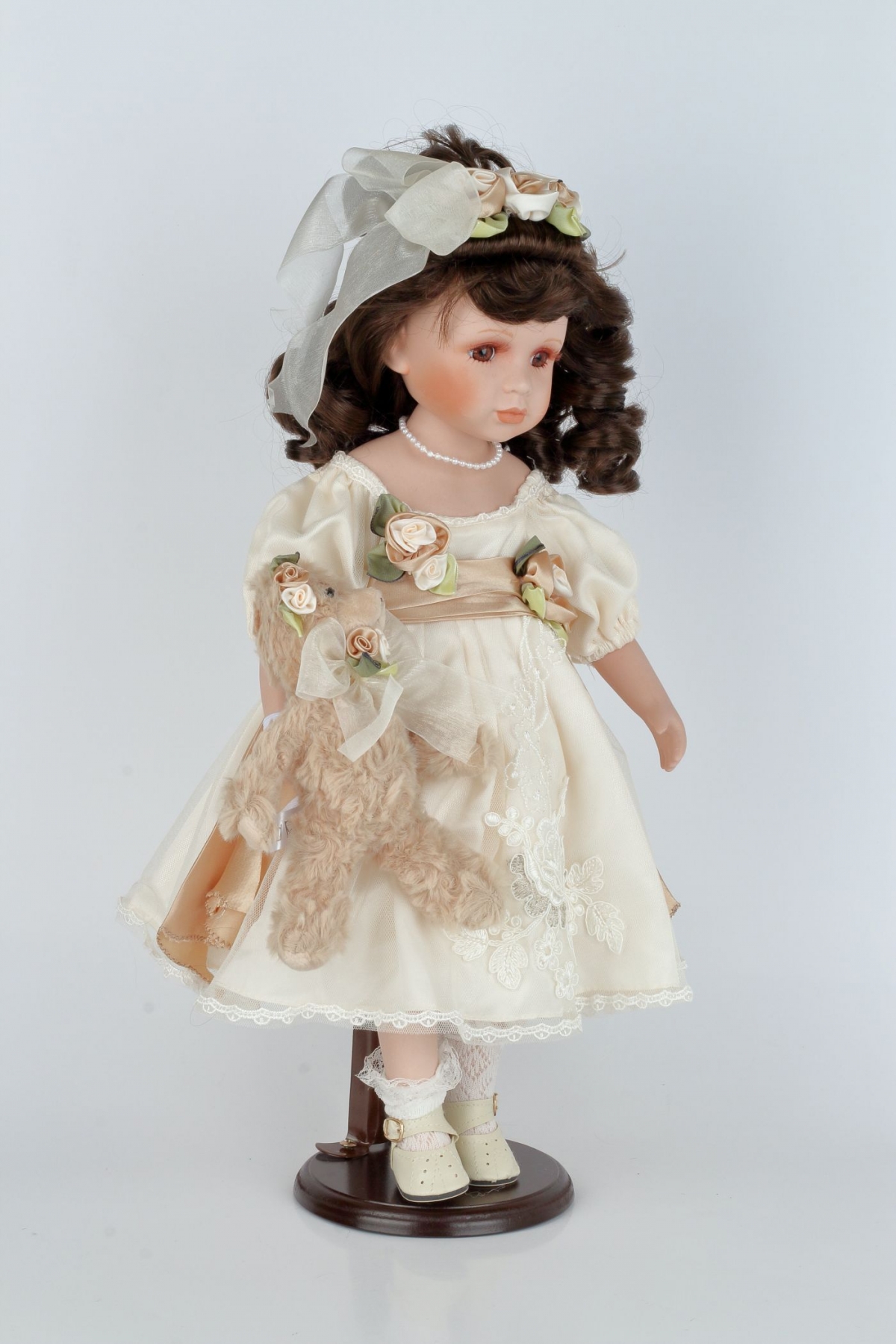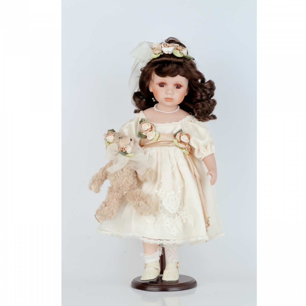 Sběratelská panenka Karolína má něžné bílé šaty s hnědými a zelenými prvky. V ruce svírá roztomilého plyšového medvídka. Panenka je umístěná na podstavci, díky kterému si ji můžete hrdě vystavit na viditelné místo.