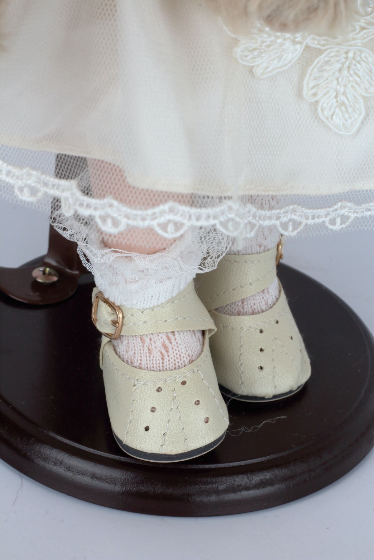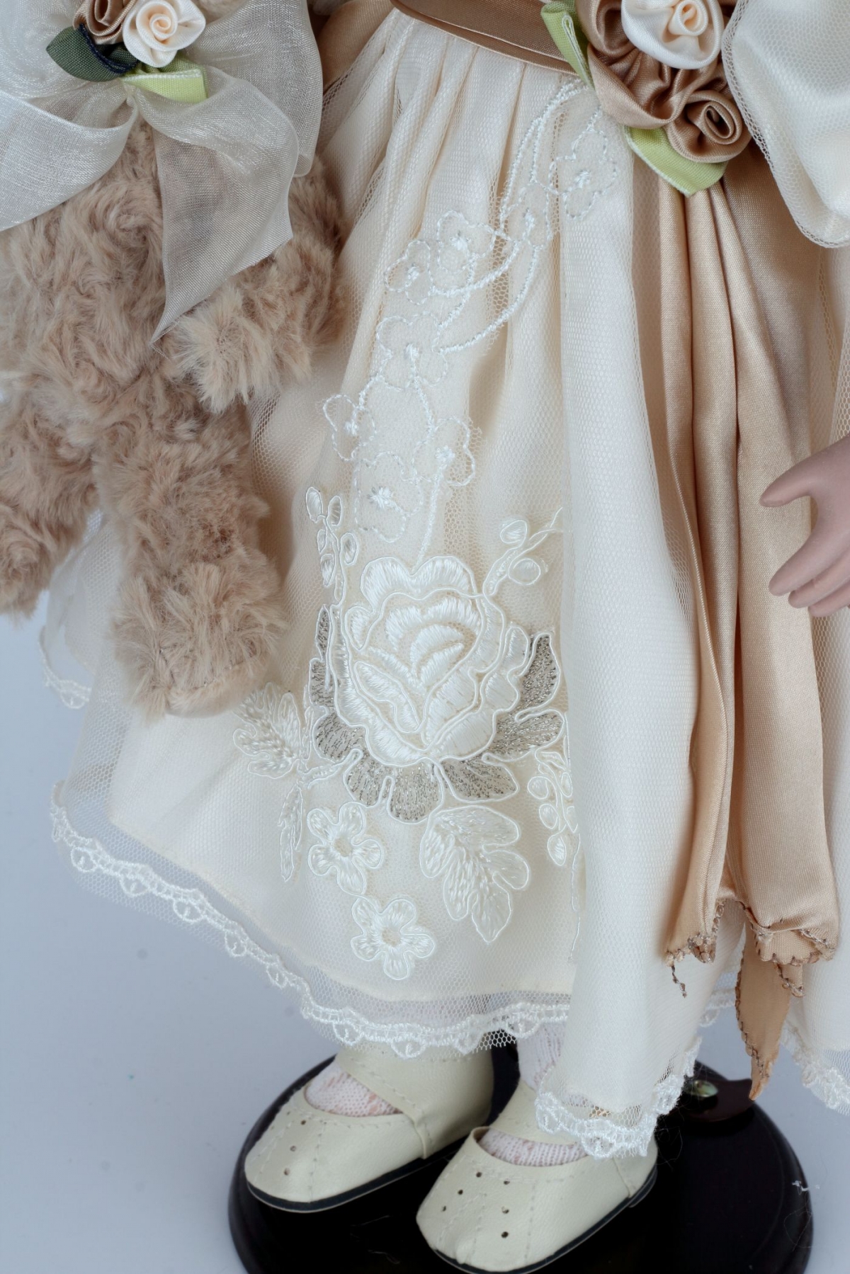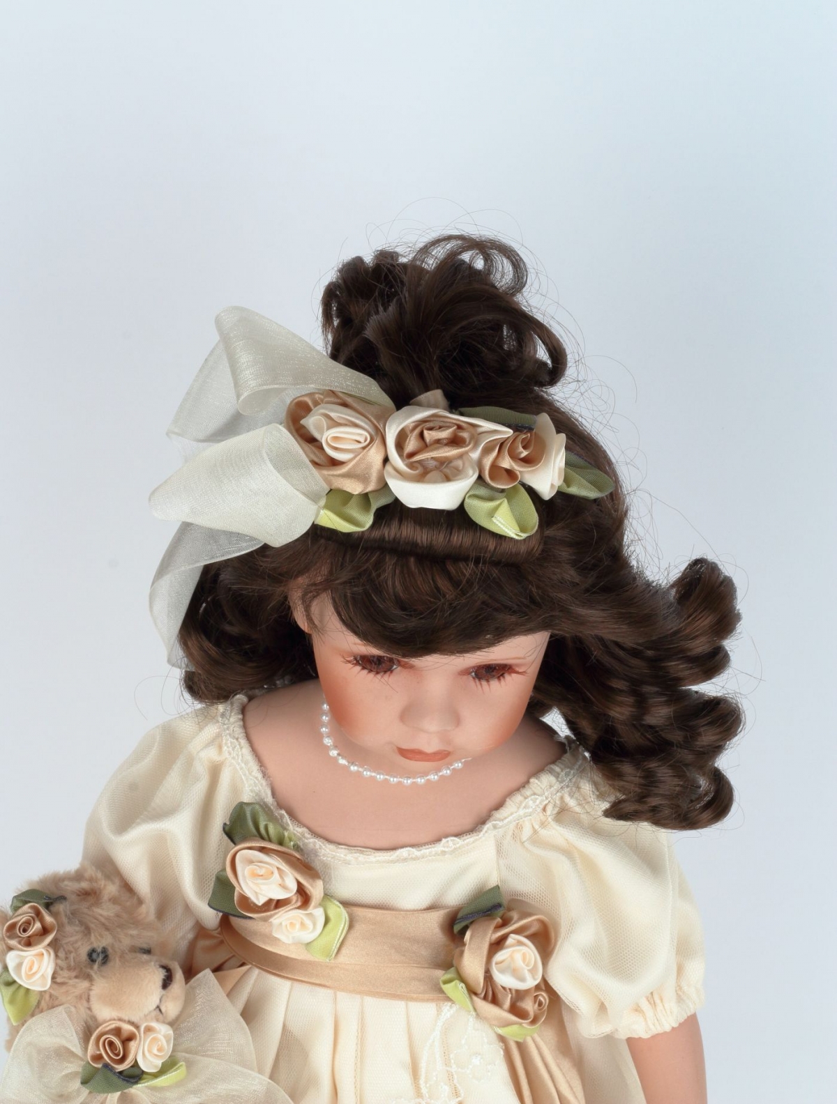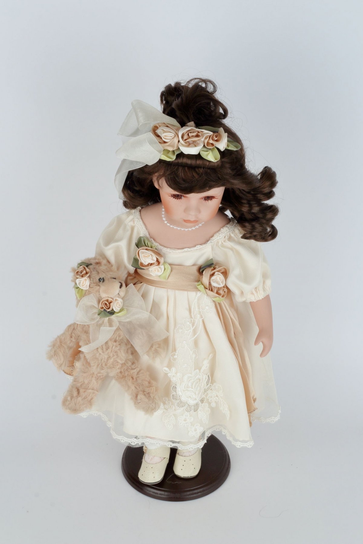 Sběratelská panenka Karolína má něžné bílé šaty s hnědými a zelenými prvky. V ruce svírá roztomilého plyšového medvídka. Panenka je umístěná na podstavci, díky kterému si ji můžete hrdě vystavit na viditelné místo.