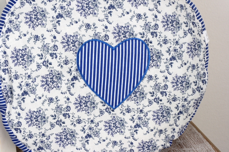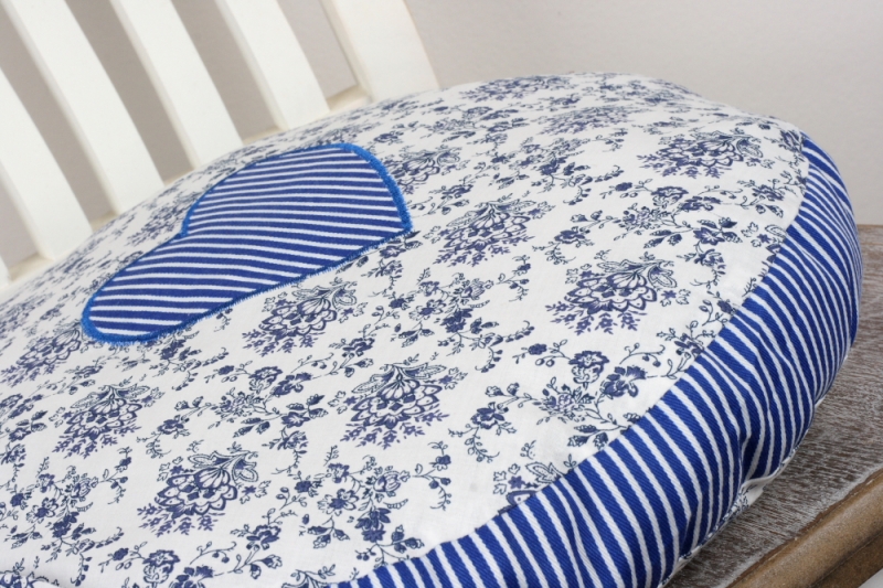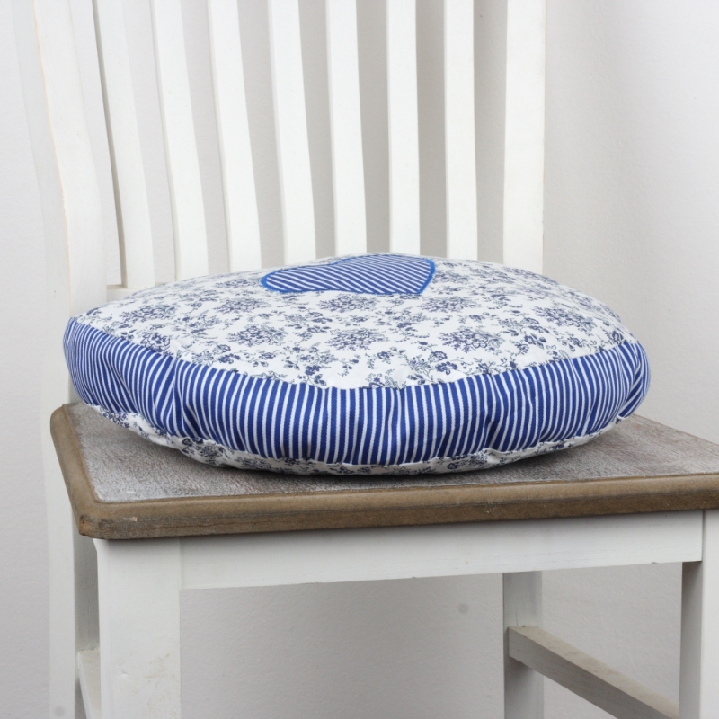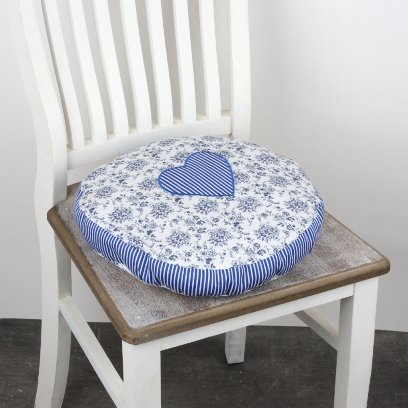 Kulatý sedák na židli je silně polstrovaný a vy tak budete mít dokonalé pohodlí. Je ušit z látek s motivem proužků a drobných květin, které krásně spolu krásně ladí.