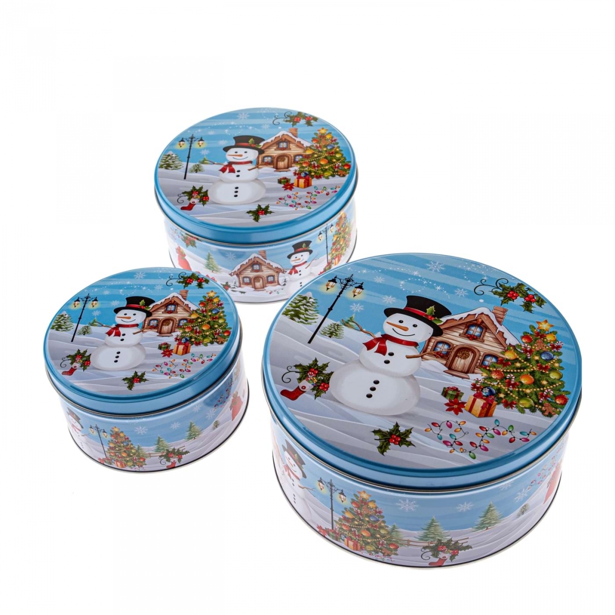 Sada 3 plechových dóz na cukroví se sněhulákem – 19,5 × 19,5 × 9 cm