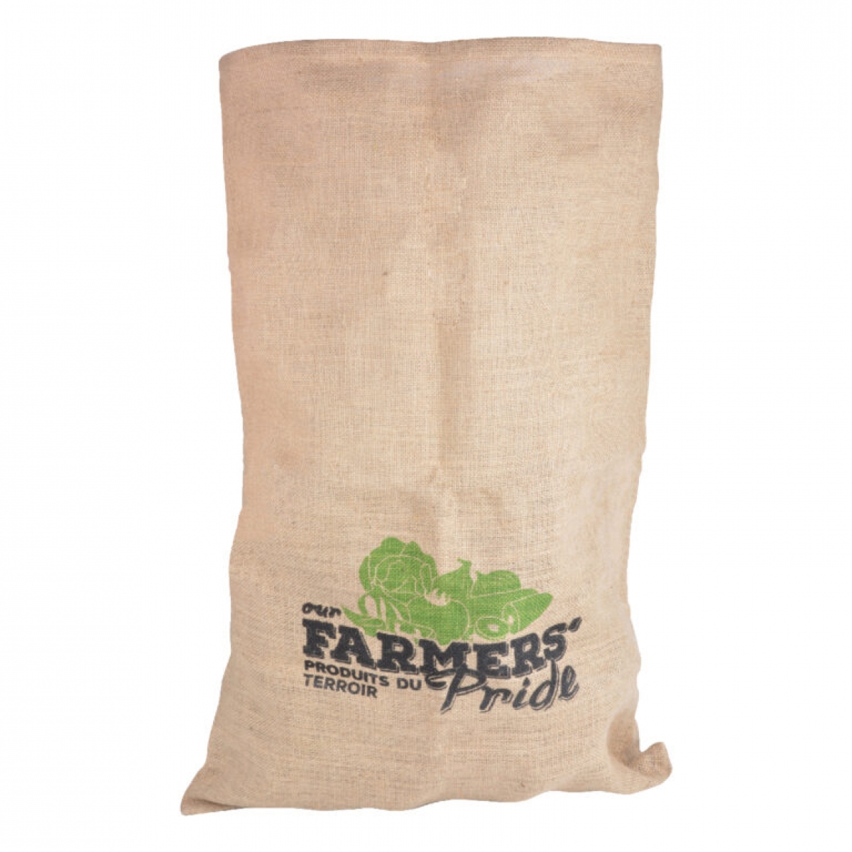 Přední strana, této skladovací tašky, je opatřena zeleno černým potiskem, zobrazujícím různou zeleninu a nápis FARMERS Pride. Neztratí se v kuchyni, komoře, dílně ani v zahradním domečku.