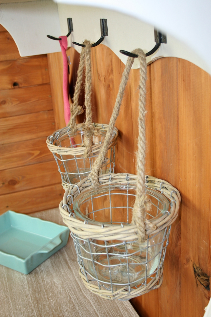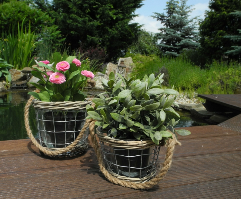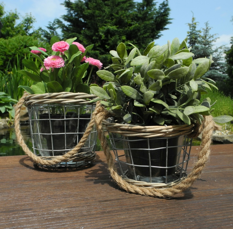 Skleněný květináč je zasazen do drátěného výpletu, doplněn o proutí a lýkový provaz.