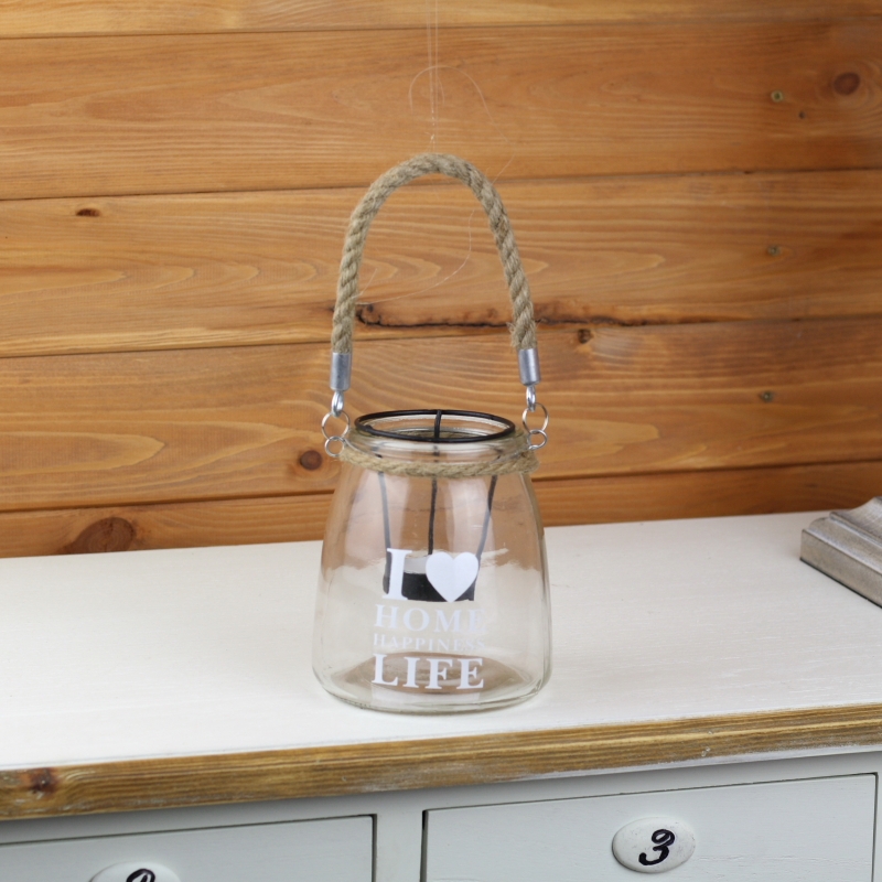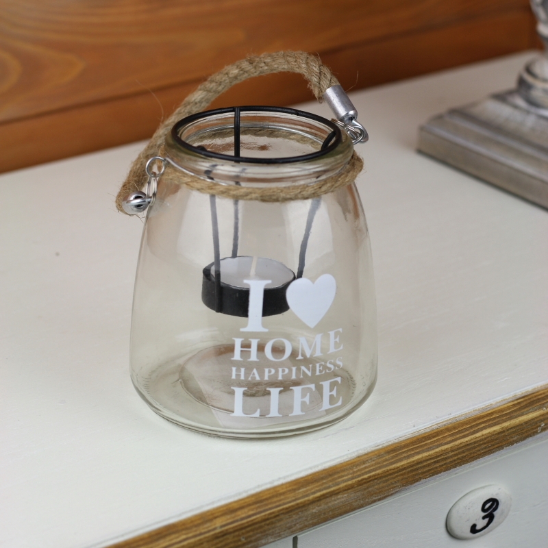 Skleněný svícen I love home 14cm na jednu čajovou svíčku, která zahalí prostor romantickým tlumeným světlem.