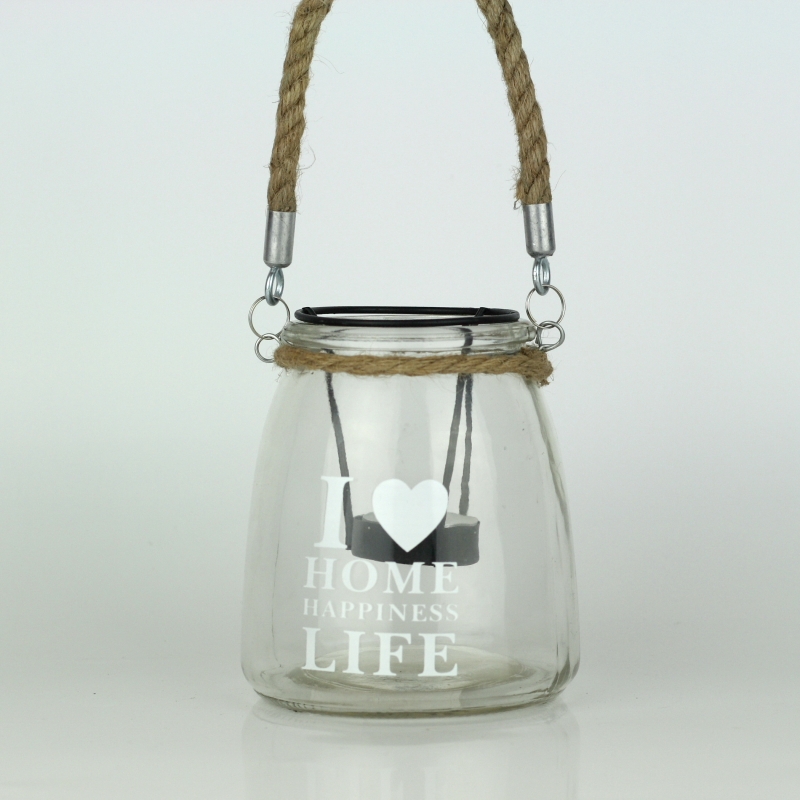 Svícen ze skleněné čiré dózy má na přední straně bílý nápis. Má i praktické ucho na přenášení. I vkládání čajových svíček je vyřešeno velmi šikovně. Stačí vytáhnout kovovu vsadku a svíku do ní vložit. Jednoduše pak zapálenou víčku umístíte dovnitř lucerny aniž by Vám zhasla.