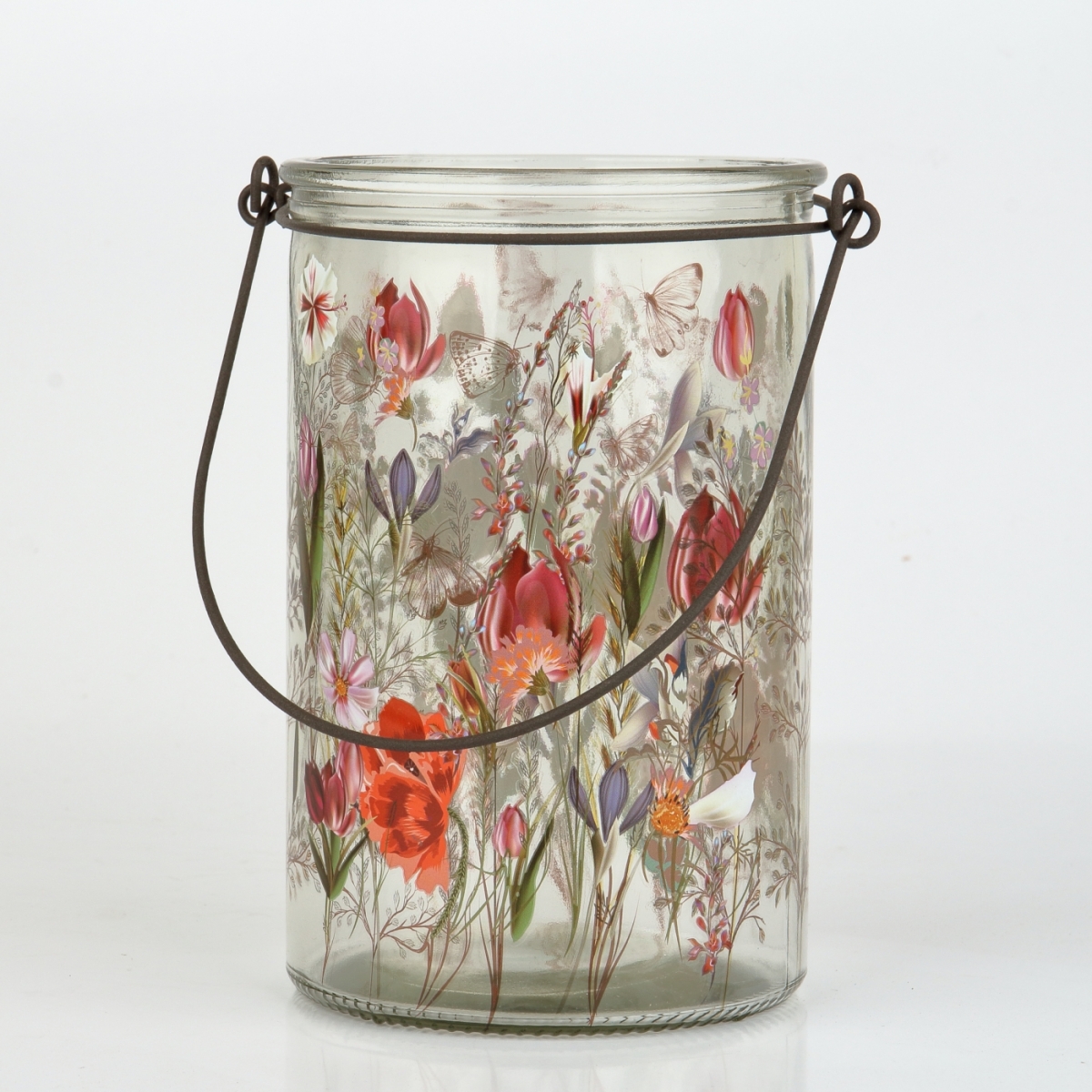 Skleněný svícen je opatřen i kovovu obručí se závěsem. Můžete tak lucerničku použít i pro účel zavěšení do prostoru a lucerničku doplnit ze stejné kolekce skleněným malovaným svícnem 10cm.