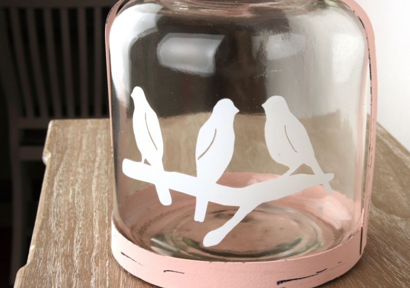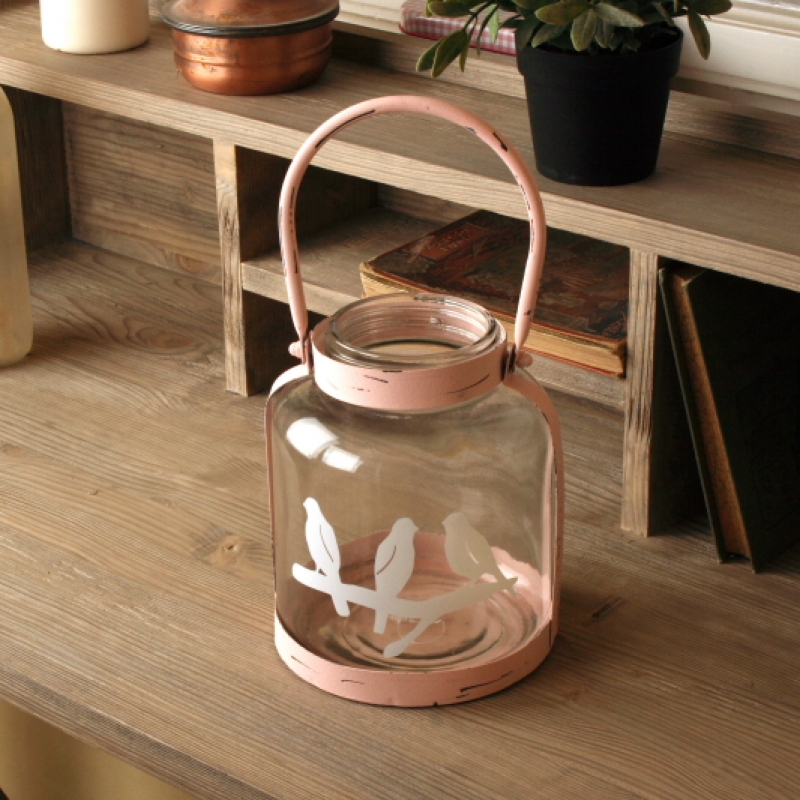 Skleněný svícen s kovovým uchem růžový 18cm a motivem ptáčků na větvi v nás vyvolává jarní náladu.