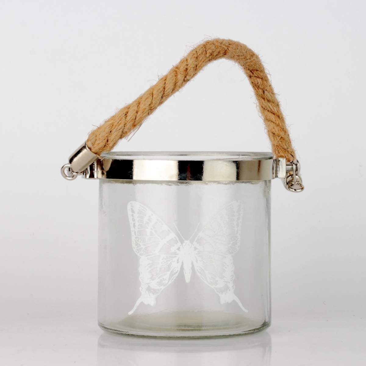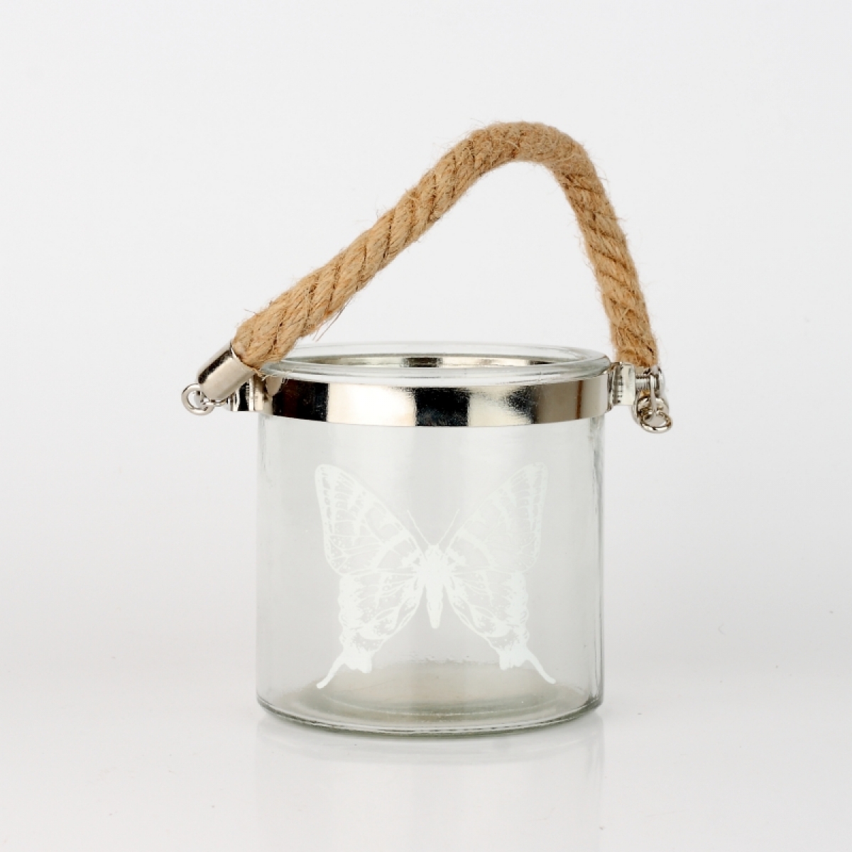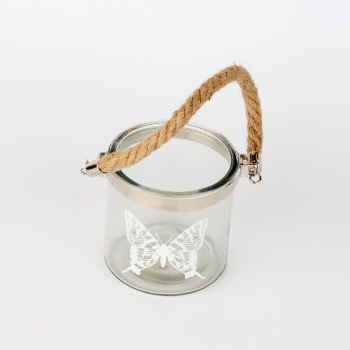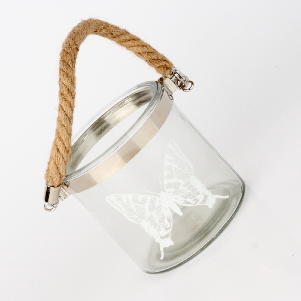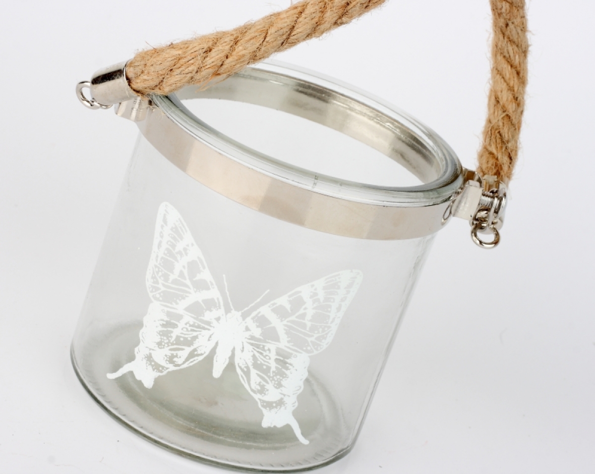 Skleněný svícen s motivem motýla, ozdobným proužkem a přírodním provázkem na zavěšení.