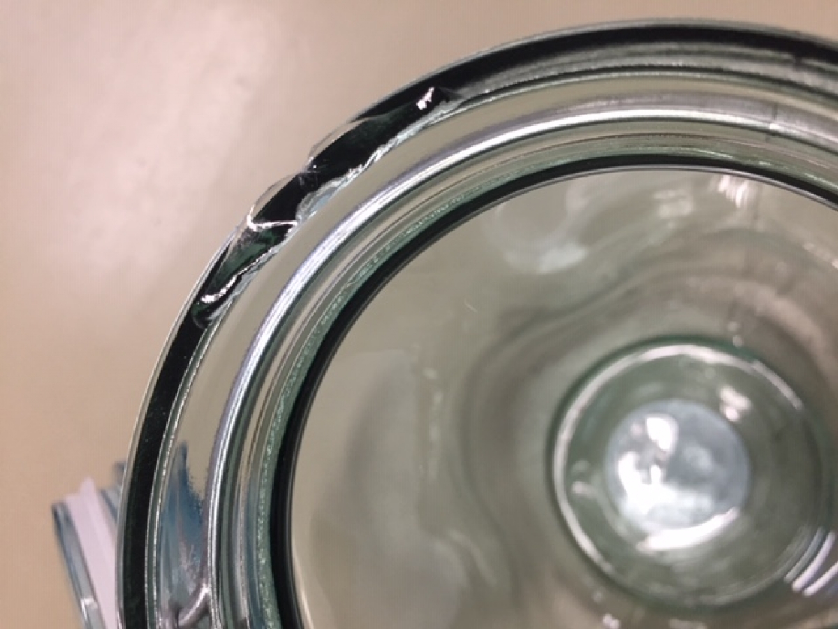 Sklenice s patentním uzávěrem je vyřazená z důvodu poškození na hrdle (foto 3 a 4). Poškození nejde po uzavření sklenice vidět a dóza tak může nadále sloužit pro uložení sušeného ovoce, cukrovinek, nebo bylinek z vaší zahrádky.
