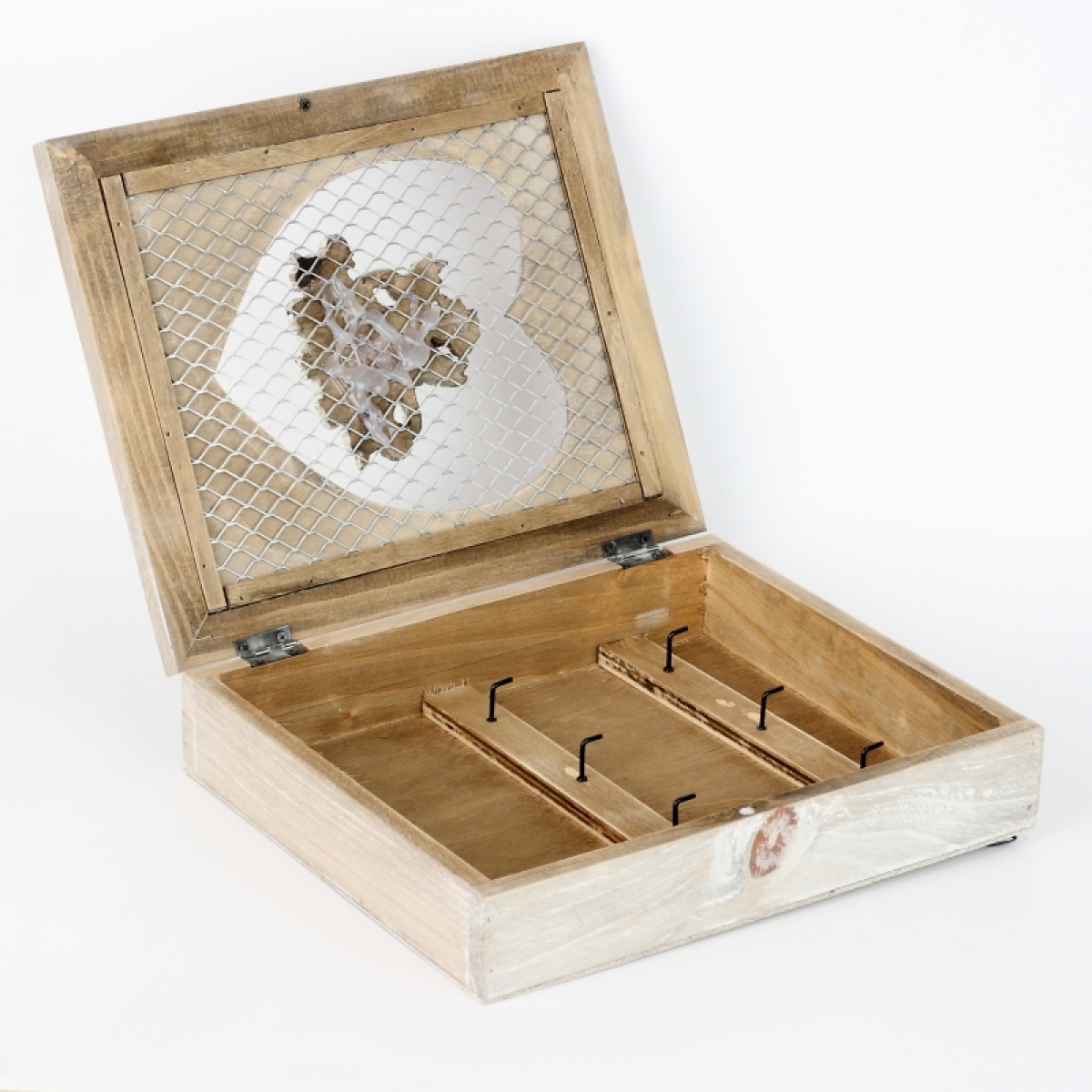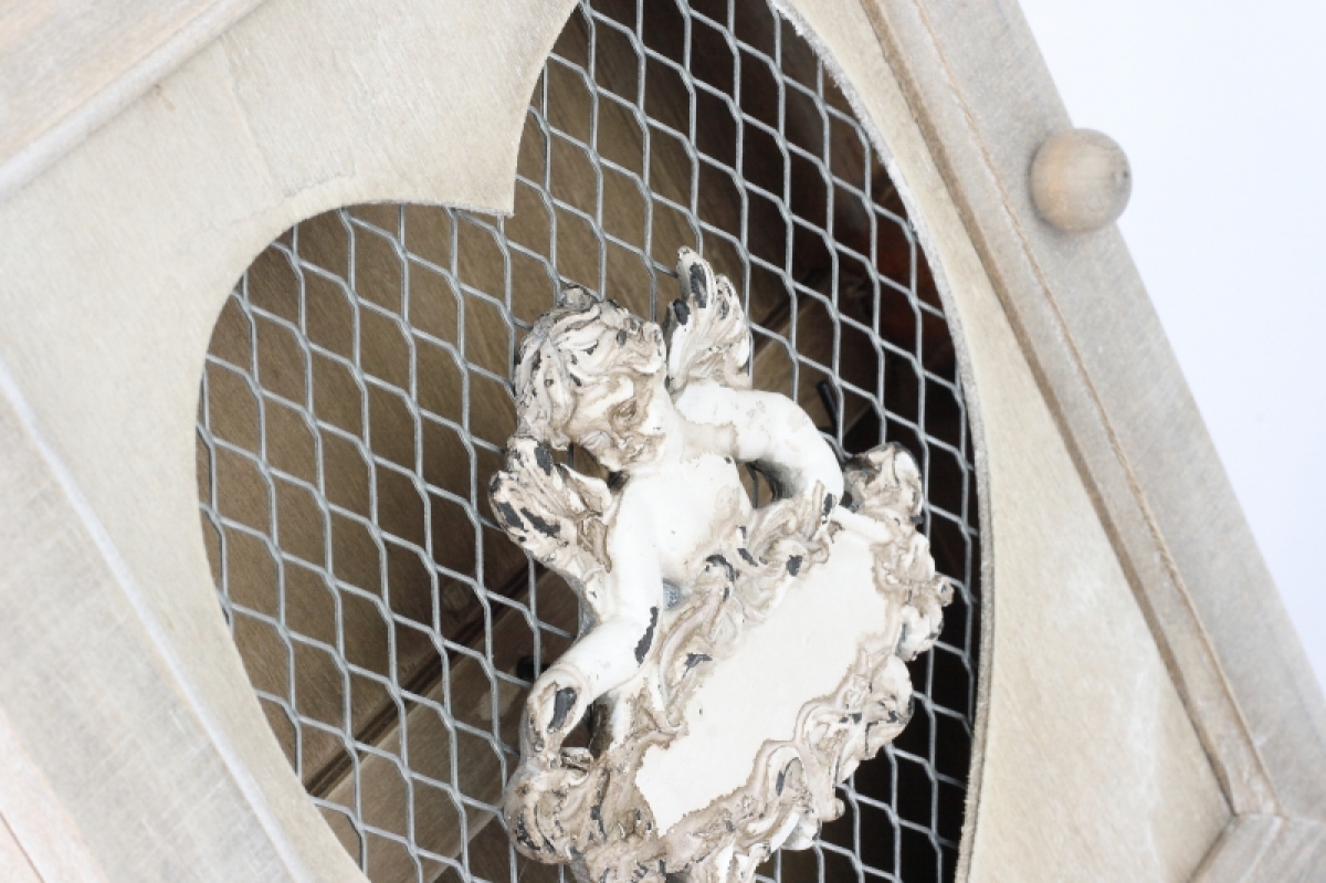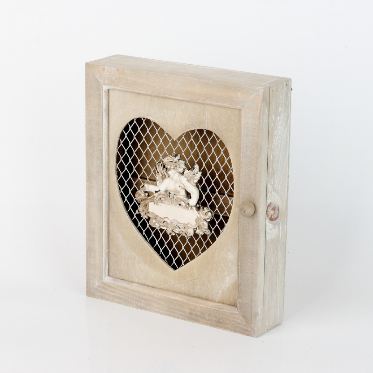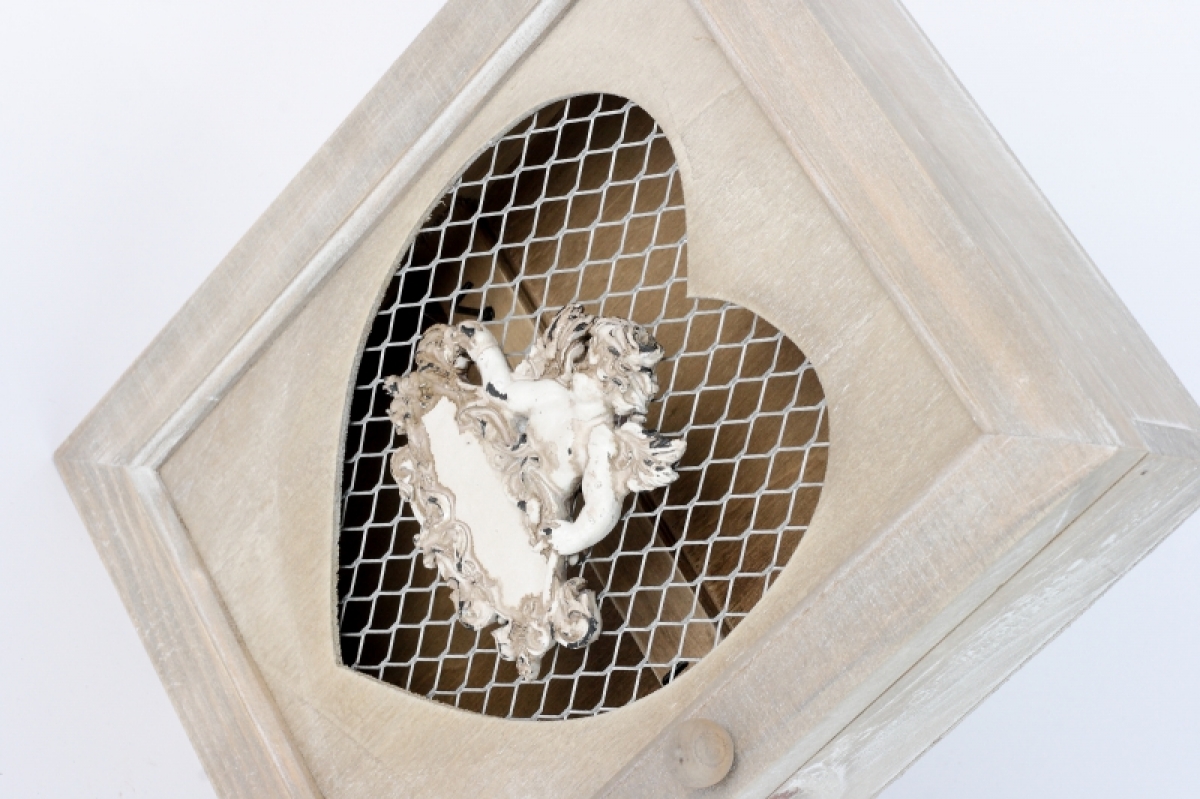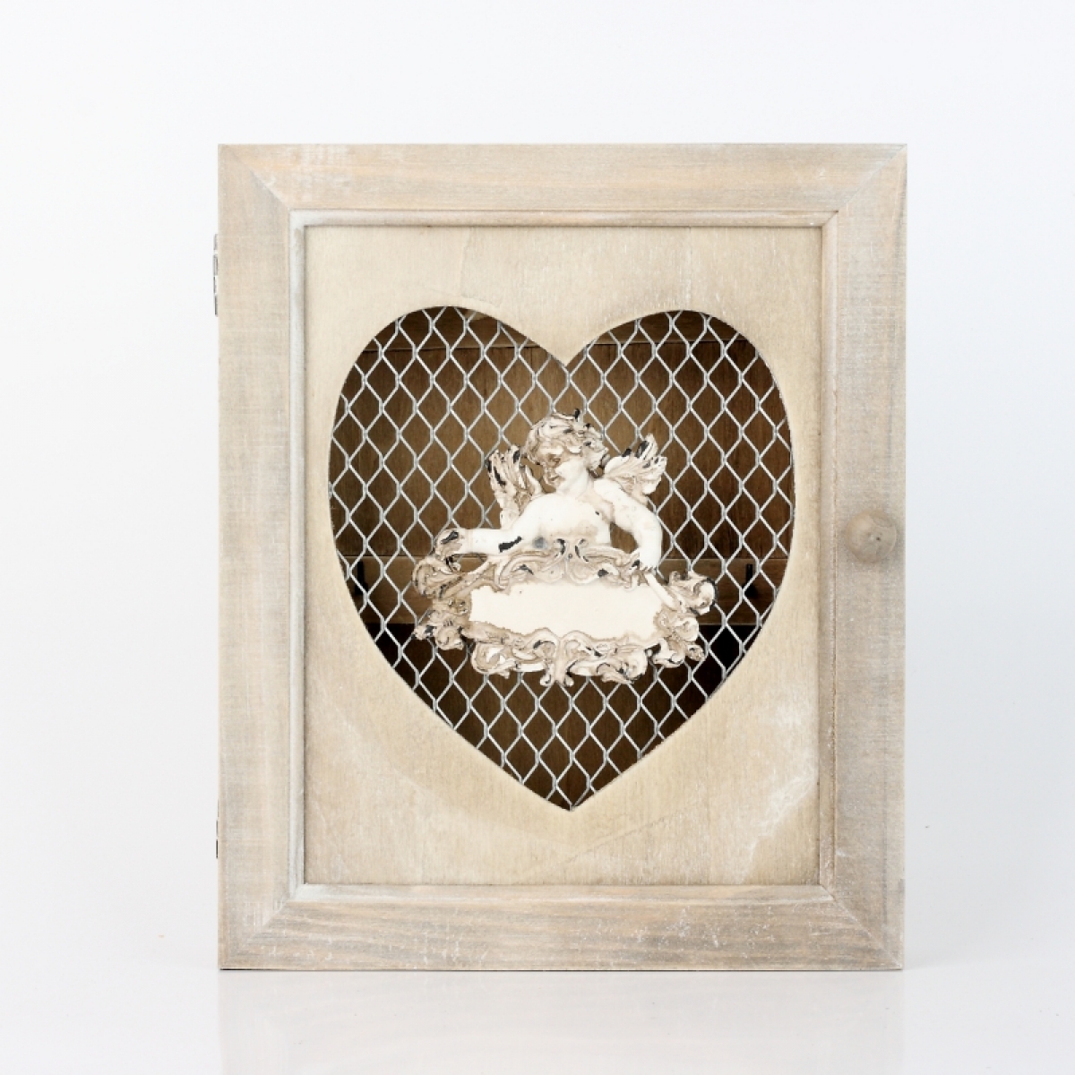 Dřevěná skříňka na klíče s andělem. V okénku ve tvaru srdce je pletivo.