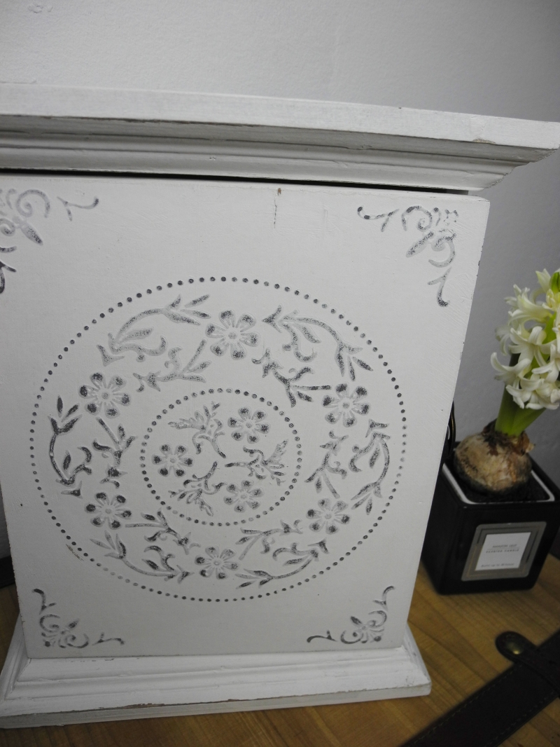 Bílá skříňka na klíče s reliéfem na dvířkách - květinový motiv. Skříňka má 6 háčků na klíče. ze zadní strany dva kovové úchyty pro snadné zavěšení na stěnu (kovové panty, kovové zavírání dvéřek).
